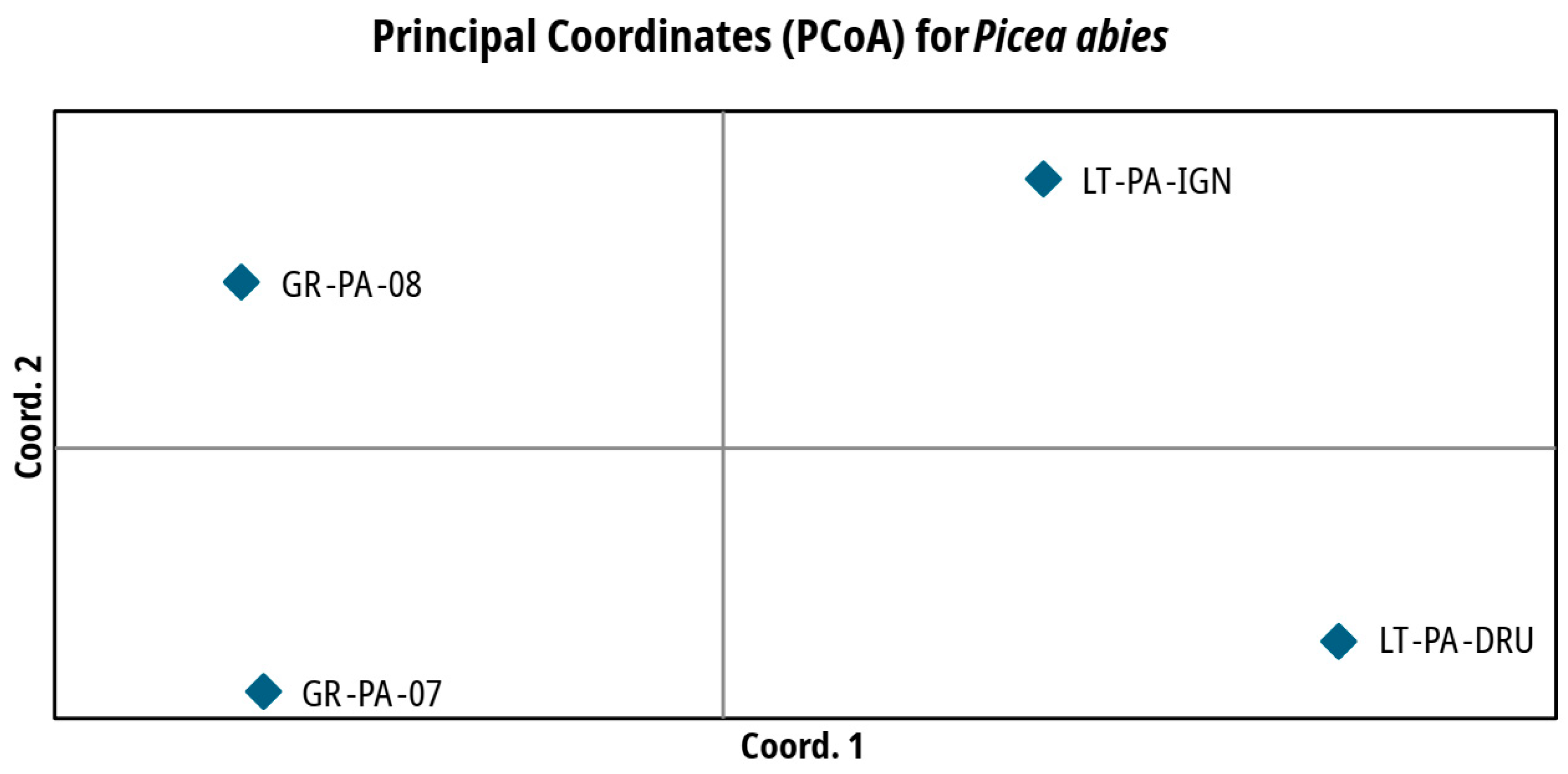 - Unger, G.M.; Konrad, H.; Geburek, T. Does spatial genetic structure increase with altitude? An answer from Picea abies in Tyrol, Austria. Plant Syst. Evol. 2011, 292, 133–141. [Google Scholar] [CrossRef]