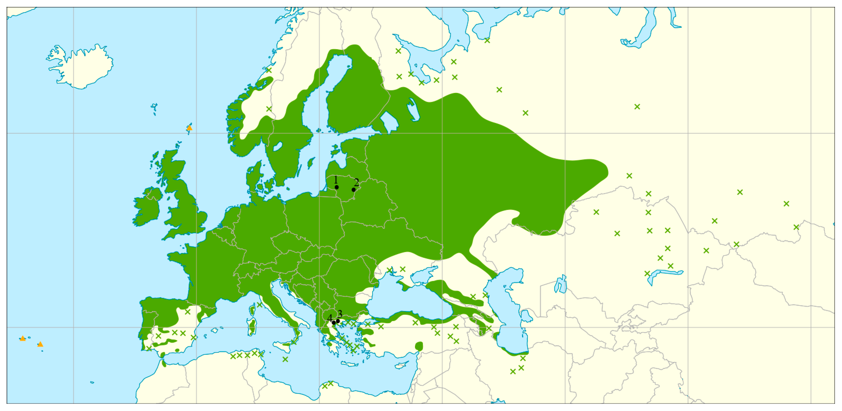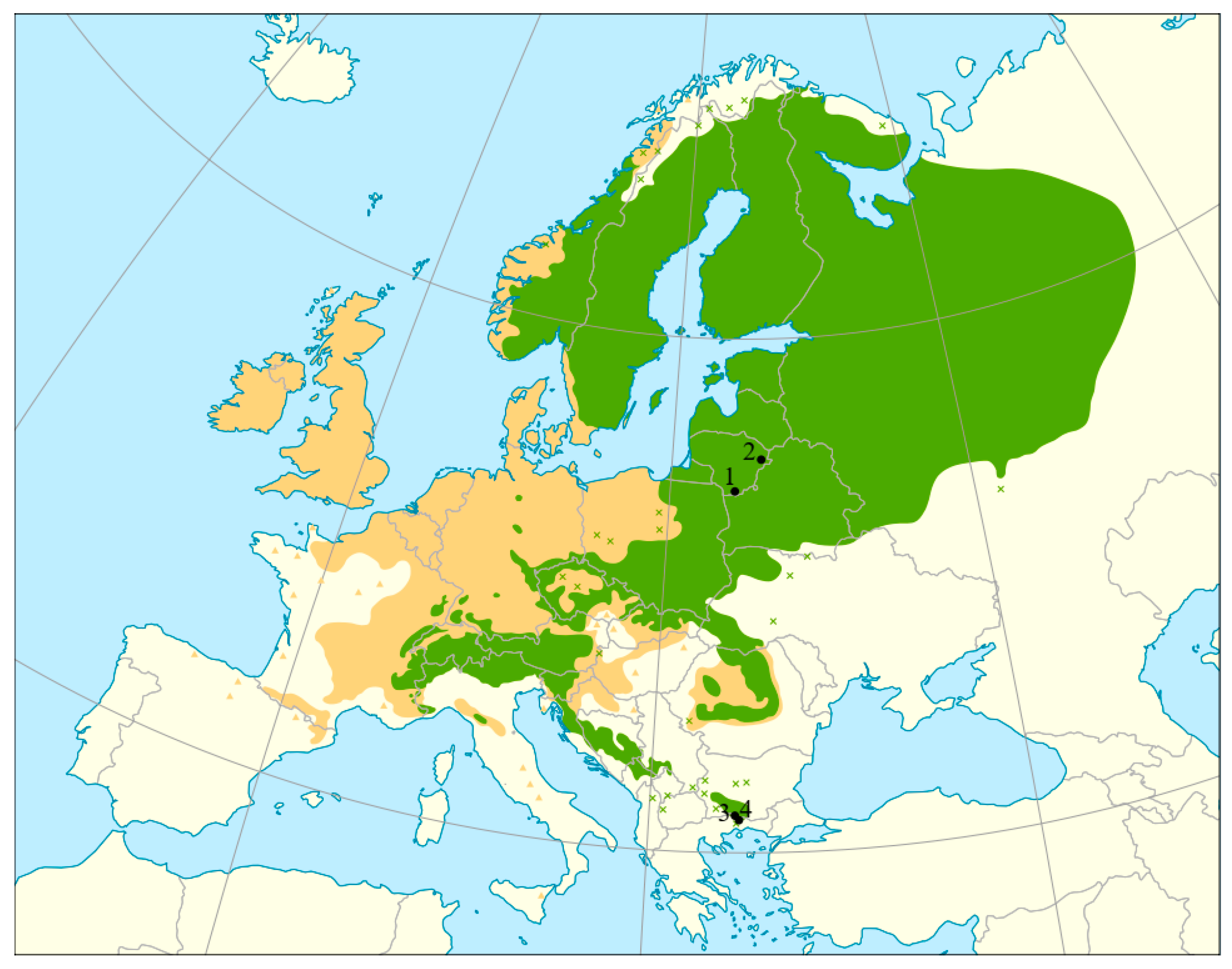 - Jalas, J.; Suominen, J. (Eds.) Atlas Florae Europaeae: Distribution of Vascular Plants in Europe—Vol. 2: Gymnospermae (Pinaceae To Ephedraceae); Committee for Mapping the Flora of Europe/Societas Biologica Fennica Vanamo: Helsinki, Finland, 1973; p. 40. [Google Scholar]