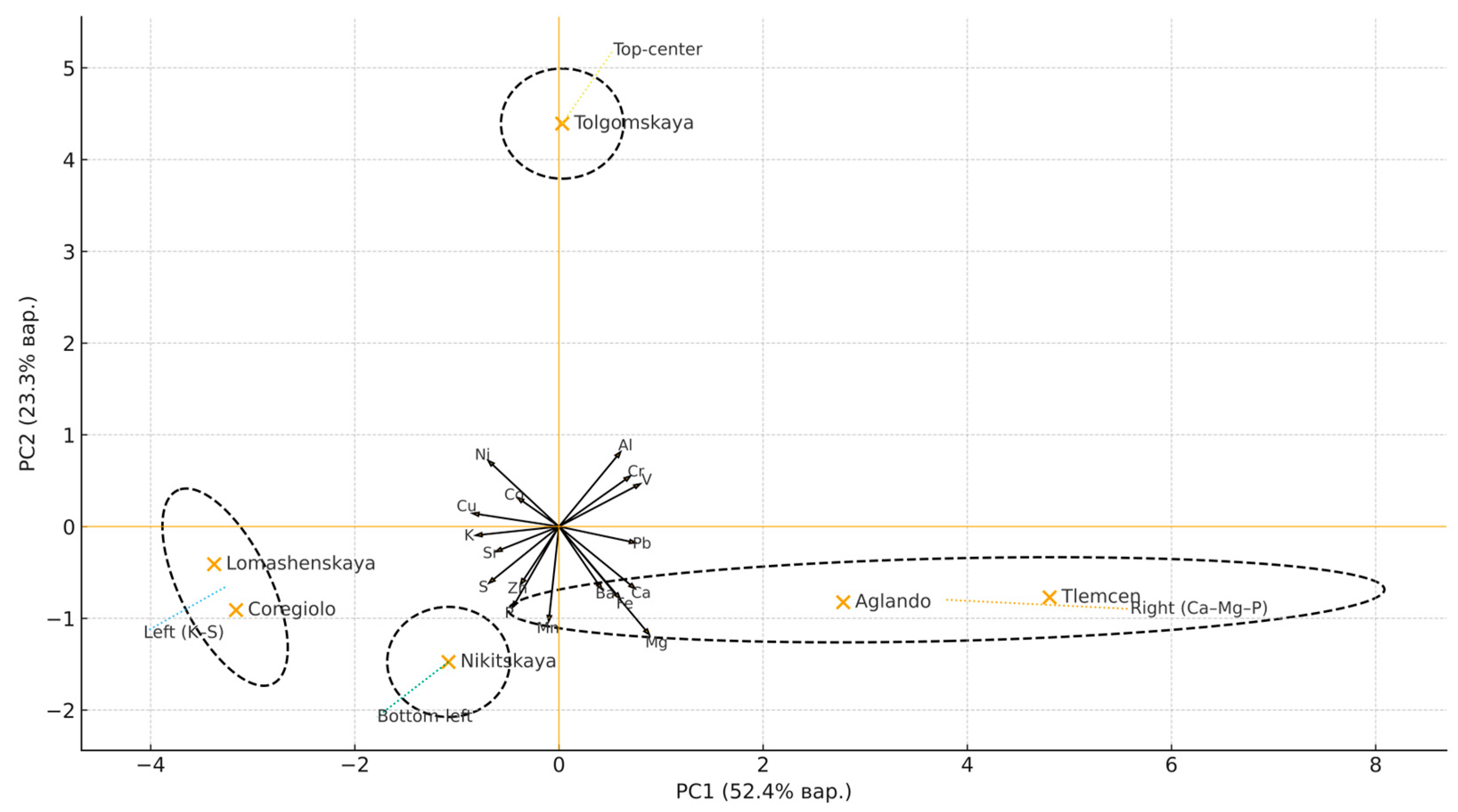 - Romanova, E.V.; Kalugina, O.V.; Zaitseva, L.V. Geochemical Features of Soils of the Southern Coast of Crimea and Their Influence on the Accumulation of Trace Elements in Plants. Geokhimiia 2019, 64, 987–996. [Google Scholar] [CrossRef]