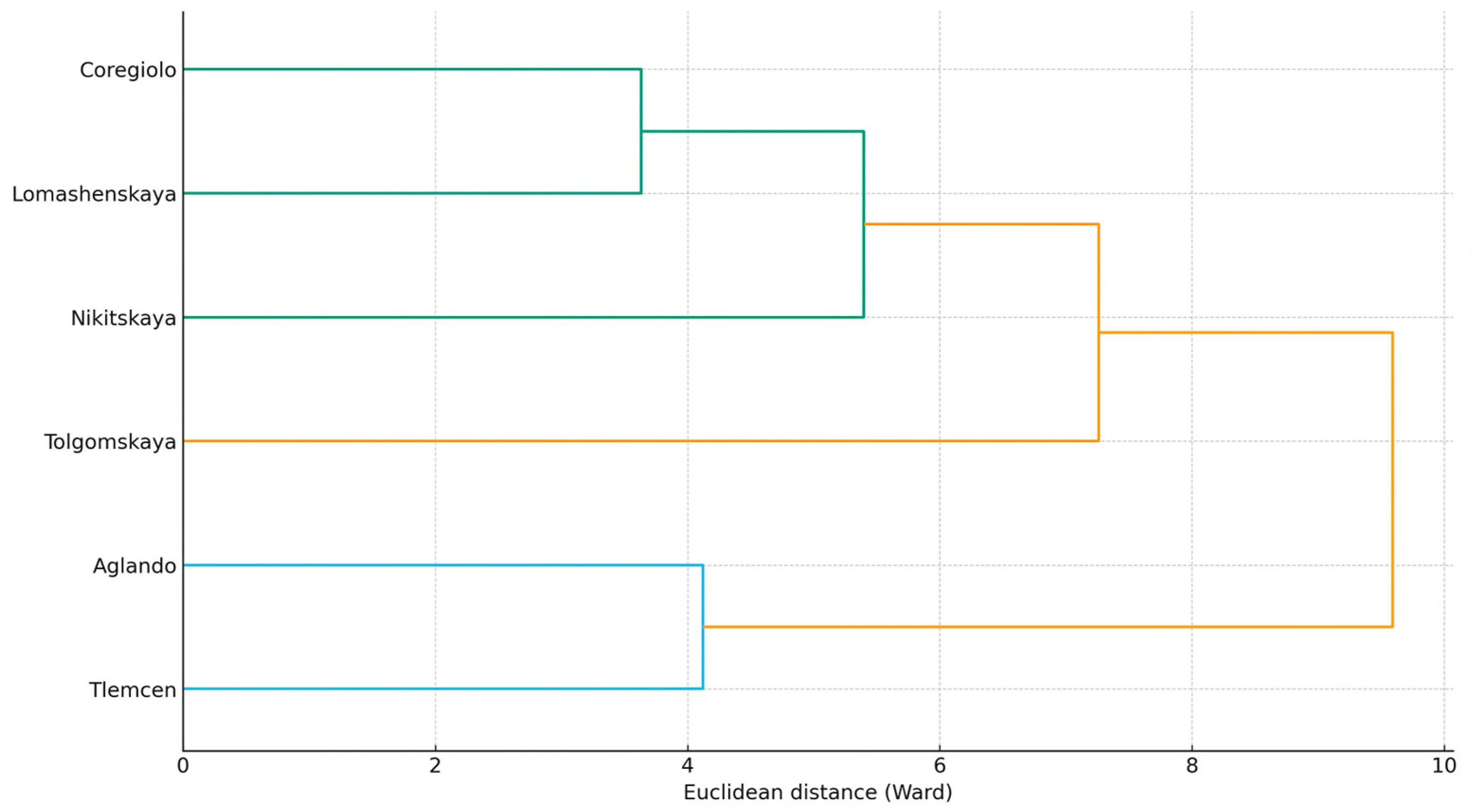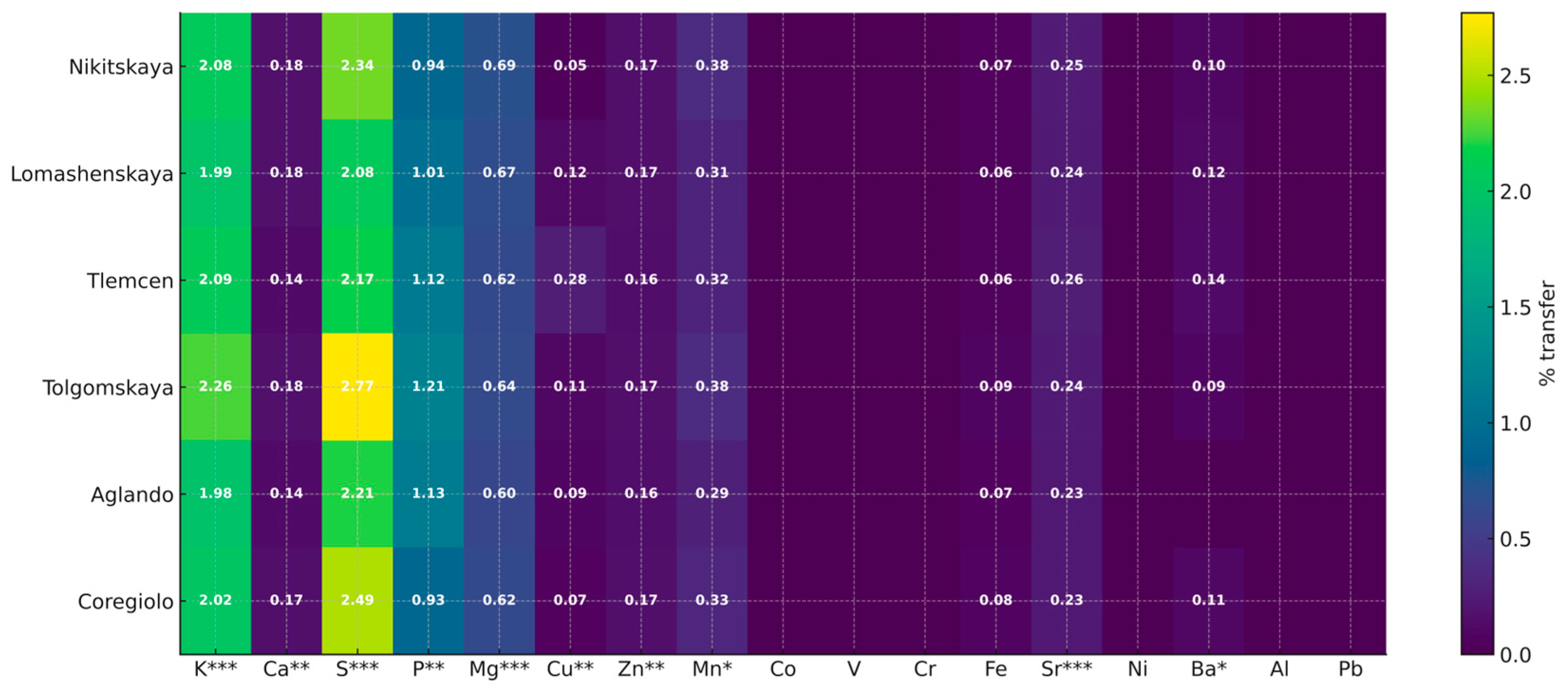 | ‘Nikitskaya’ | ‘Tlemcen’ | ‘Aglando’ | ‘Coregiolo’ | ‘Lomashenskaya’ | ‘Tolgomskaya’ | Leaf | Tisane | |||||||