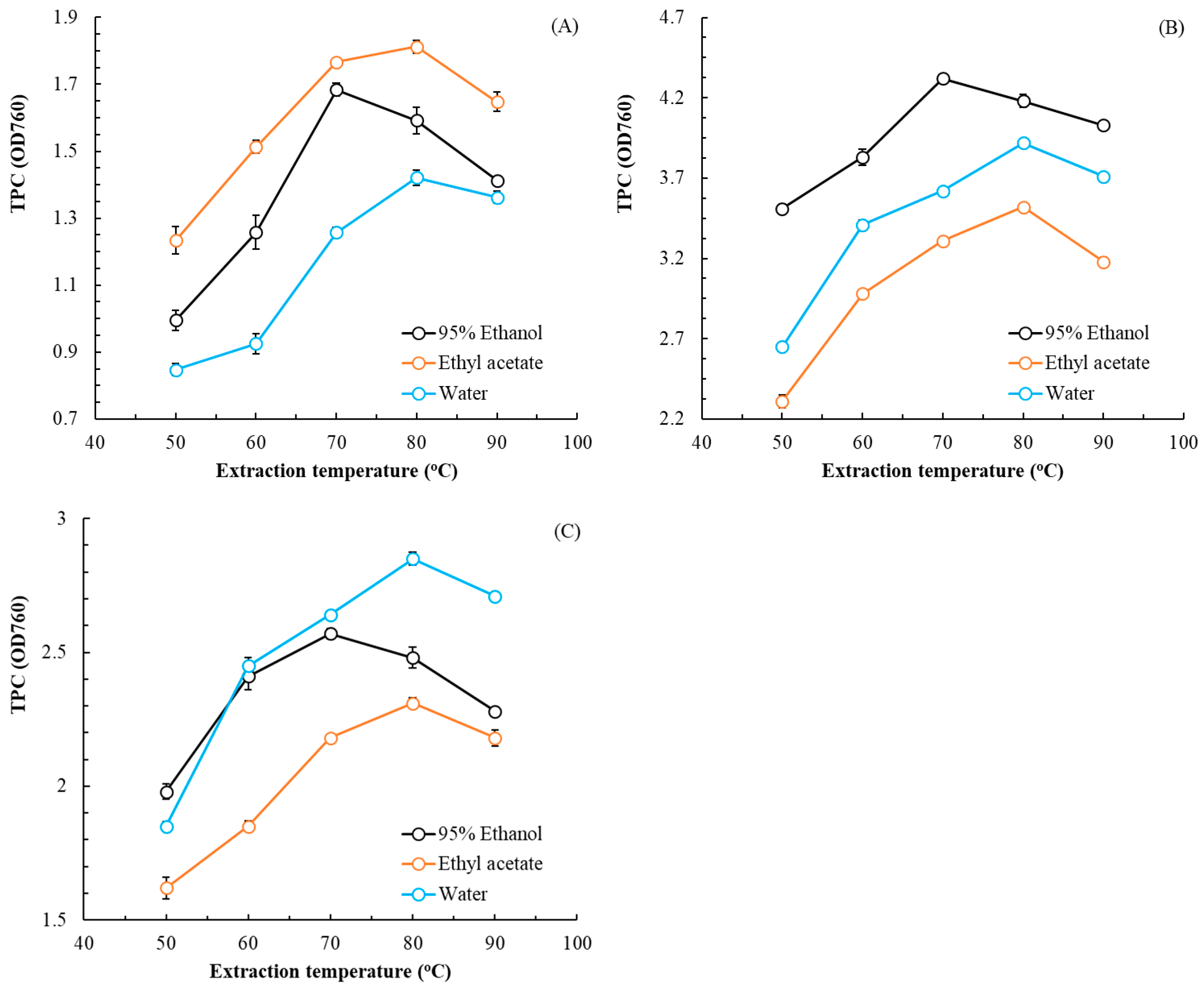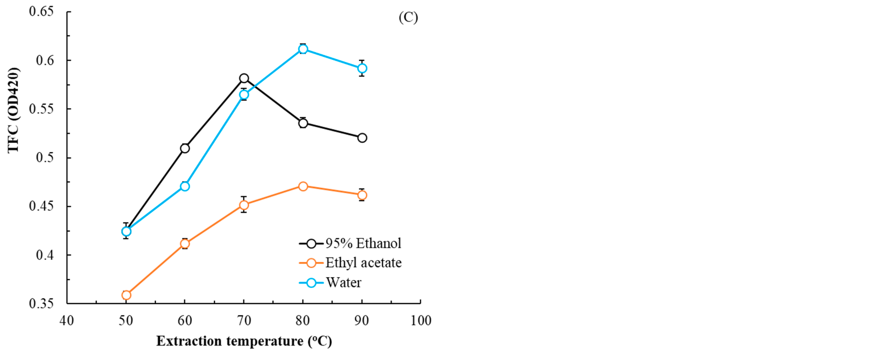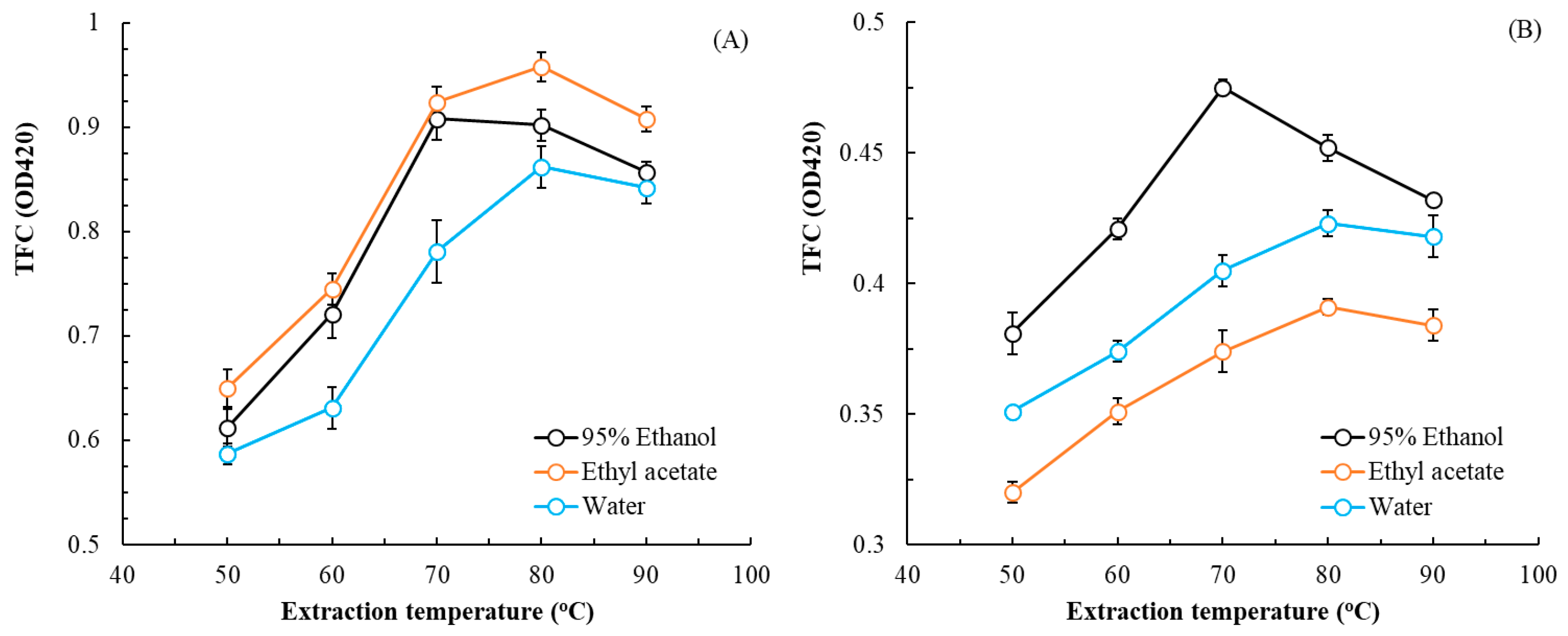 The effects of extraction temperature and solvent choice on TPC are illustrated in Figure 1, and the effects of these parameters on TFC are illustrated in Figure 2. For leaf, rhizome, and flower extracts, the optimal extraction temperatures were 80, 70, and 80 °C, respectively, and the optimal solvent choices were ethyl acetate, 95% ethanol, and water, respectively. As extraction temperature increased, TPC and TFC first increased and then decreased. The extract with the highest TFC was the leaf extract; the extract with the highest TPC was the rhizome extract. For extractions in subsequent experiments, these optimal solvent choices and temperatures were, respectively, applied for each part of the plant.