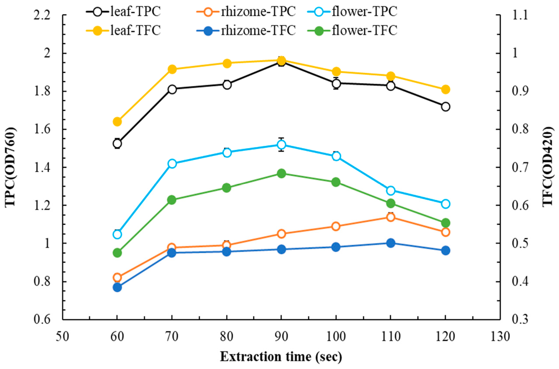 Figure 3 illustrates how extraction time influences TPC and TFC. As extraction time increased, TPC and TFC first increased and then decreased. For leaf, rhizome, and flower extracts, the optimal extraction times were 90, 110, and 90 s, respectively (to facilitate comparison, TPC values for rhizome and flower extracts are presented at dilutions of ×4 and ×2, respectively). Extractions in subsequent experiments were completed using these optimal extraction times for each part of the plant.