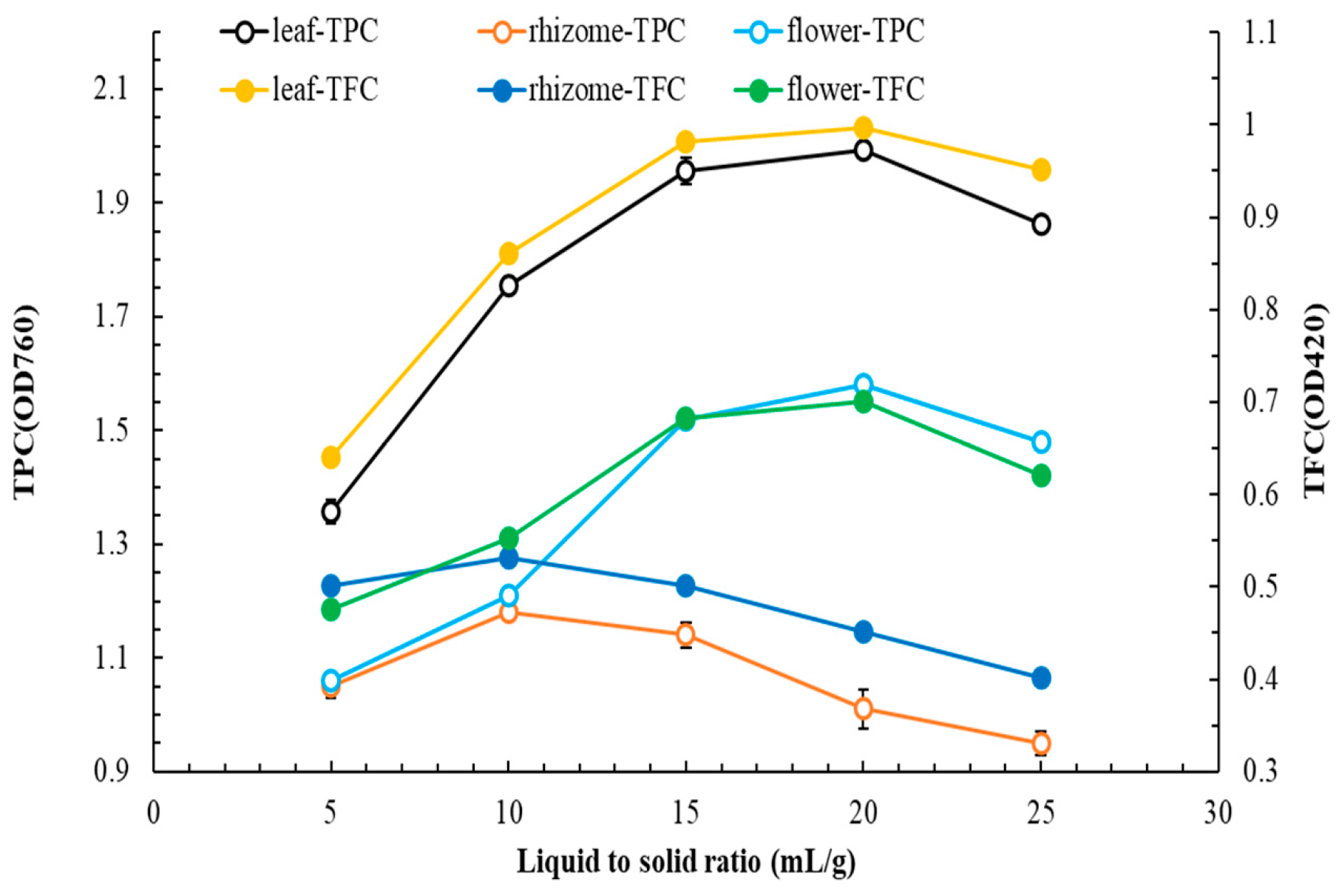 Figure 4 illustrates how the L/S ratio influences TPC and TFC. As the L/S ratio increased, TPC and TFC first increased and then decreased. For leaf, rhizome, and flower extracts, the optimal L/S ratios were 20, 10, and 20, respectively.