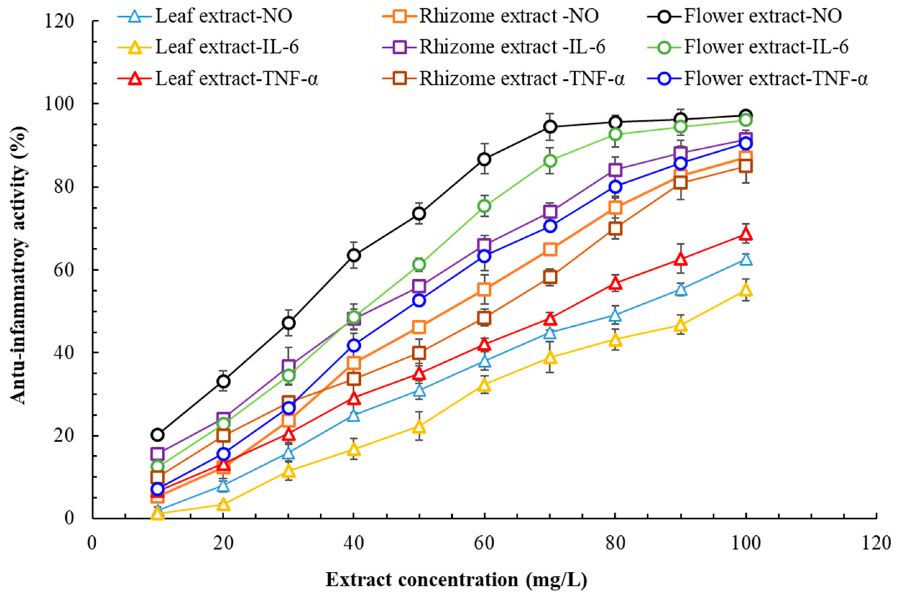 Inflammation is a common feature of many diseases; therefore, anti-inflammatory activity is widely applied in medicine, healthcare, and cosmeceuticals. During inflammation, the inflammatory mediators Interleukin-6 (IL-6) and Tumor necrosis factor-α (TNF-α) induce the expression of a complex set of genes in endothelial cells, indicating an inflammatory state [25]. Elevated nitric oxide (NO) levels are another marker of inflammation [26]. Consequently, this study used changes in IL-6, TNF-α, and NO levels as indicators of anti-inflammatory activity. The analytical method is briefly described as follows: experimental groups consisted of Raw264.7 cells (5 × 105 cells/mL, obtained from the BCRC) cultured with 1 mg/L lipopolysaccharides (LPS) and varying concentrations of extracts from the flowers, leaves, or rhizomes of P. cuspidatum. Two control groups were included: one cultured with LPS but without any extract, and the other cultured with DMEM medium alone. To measure the expression levels (μg/L) of IL-6 and TNF-α, cells were mixed with LPS and then cultured with the extracts for 24 h. Subsequently, IL-6 and TNF-α levels were analyzed using the IL-6 Quantikine ELISA Kit and TNF-α Quantikine ELISA Kit, respectively (R&D Systems, Minneapolis, MN, USA). The NO content (μM) in cells was determined by mixing equal volumes of cell suspension with Griess reagent. After a 10 min reaction, the absorbance at 550 nm was measured using an ELISA plate reader. The amount of NO produced in the cells was estimated based on a standard curve established using NaNO2.