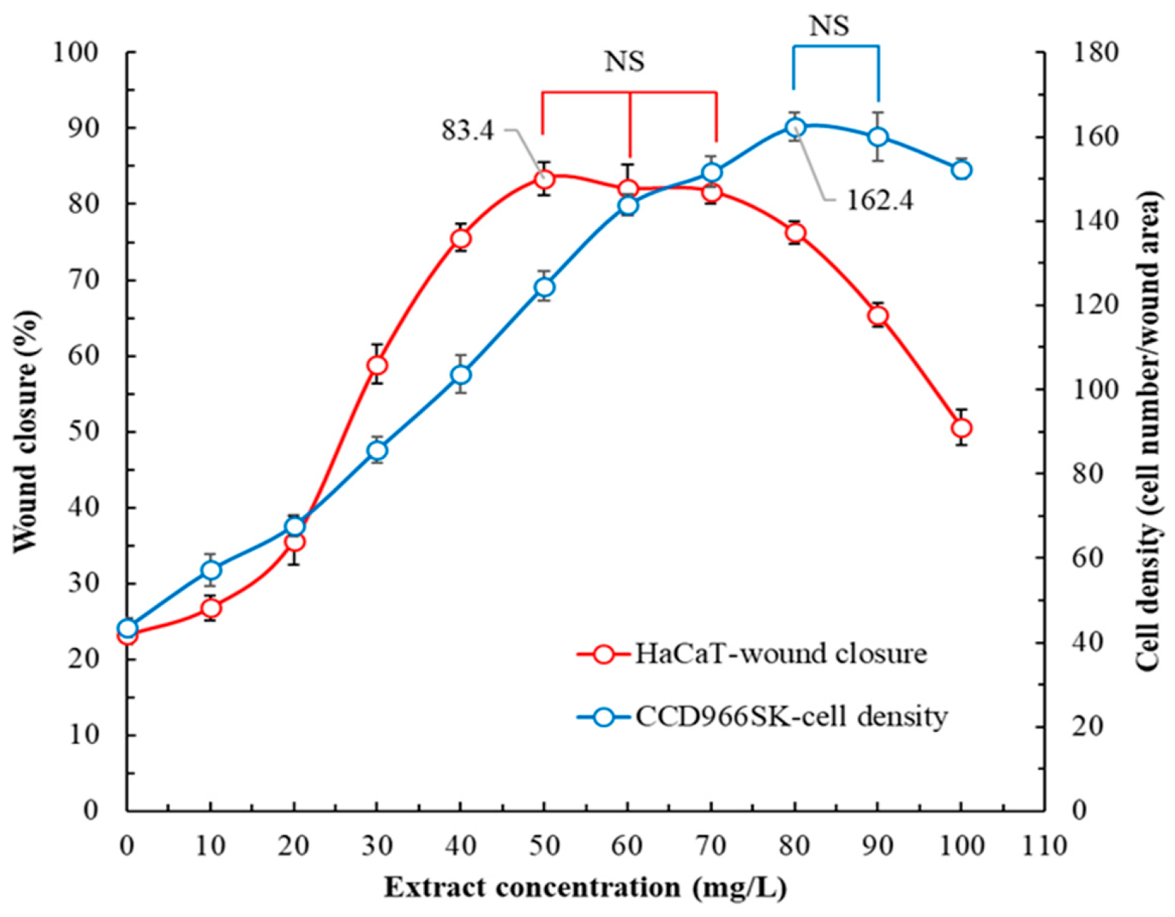 The wound healing ability of the flatland P. cuspidatum flower extract is illustrated in Figure 6. The optimal concentration of flower extract for effective wound healing differed with cell type in our evaluation of epidermal cells (the HaCaT cell line) and dermal cells (the CCD966SK cell line). The optimal concentration for epidermal cells was 50 mg/L. This concentration resulted in a wound healing rate of 83.4% ± 2.2%. The optimal concentration for dermal cells was 80 mg/L, with it yielding a cell density value of 162.4 ± 3.5 cells/wound area. The wound healing ate in a control group (not treated with the flower extract) was 23.1% ± 1.2%, with a cell density value of 43.5 ± 2.3 cells/wound area. These results indicate that treatment with the extract can increase wound healing ability by approximately 3.73-fold. Wu et al. (2012) reported that administering a 10% P. cuspidatum rhizome extract to injured mice increased wound healing ability by 1.43-fold [31].