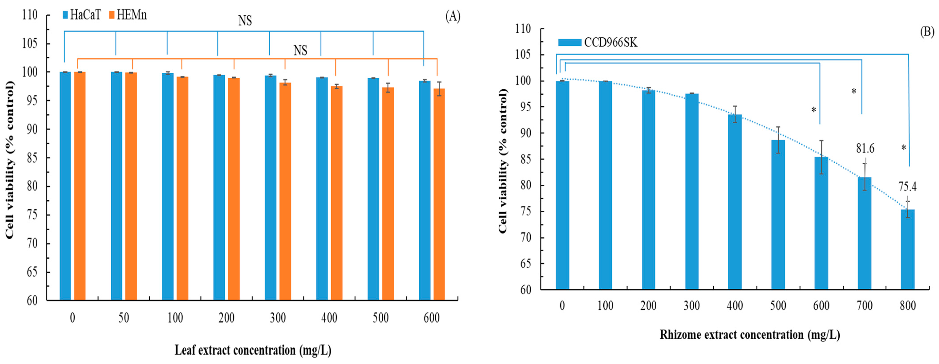 P. cuspidatum rhizome extract was not cytotoxic to HGF cells at concentrations up to 2000 mg/L [30]. According to Du et al. (2024), P. cuspidatum rhizome extract is mildly cytotoxic to B16F10 cells, with a 60% survival rate observed at 62.5 mg/L [9]. In this study, we explored whether P. cuspidatum leaf extract was cytotoxic to HaCaT and HEMn cells. On the basis of IC50 values obtained from previous experiments, we used a test concentration of 600 mg/L or less. We also explored whether P. cuspidatum rhizome extract was cytotoxic to CCD966SK cells, using a test concentration of 800 mg/L or less. We also explored whether P. cuspidatum flower extract was cytotoxic to HaCaT, CCD966SK, and Raw264.7 cells, using a test concentration of 200 mg/L or less. Figure 7 illustrates the cytotoxic effects of the extracts from flatland P. cuspidatum. The leaf extract was not cytotoxic; cell viability was 97.1% ± 1.2% at 600 mg/L. By contrast, the rhizome extract exhibited pronounced cytotoxicity, with cell viability dropping below 80% (the established cytotoxicity threshold) at 800 mg/L [32]. The flower extract was not cytotoxic; cell viability was 98.0% ± 1.0% at 200 mg/L. At lower concentrations, the flower extract even promoted cell growth. Therefore, flatland P. cuspidatum extracts obtained via MAE are biosafe across a broad range of concentrations. Directly contrast the high pharmacological potential of the rhizome with its cytotoxicity limitations. This is particularly important because the flower extract was not only safe but also promoted cell proliferation at lower concentrations. Addressing this trade-off would offer a more balanced and critical evaluation of each plant part’s potential.