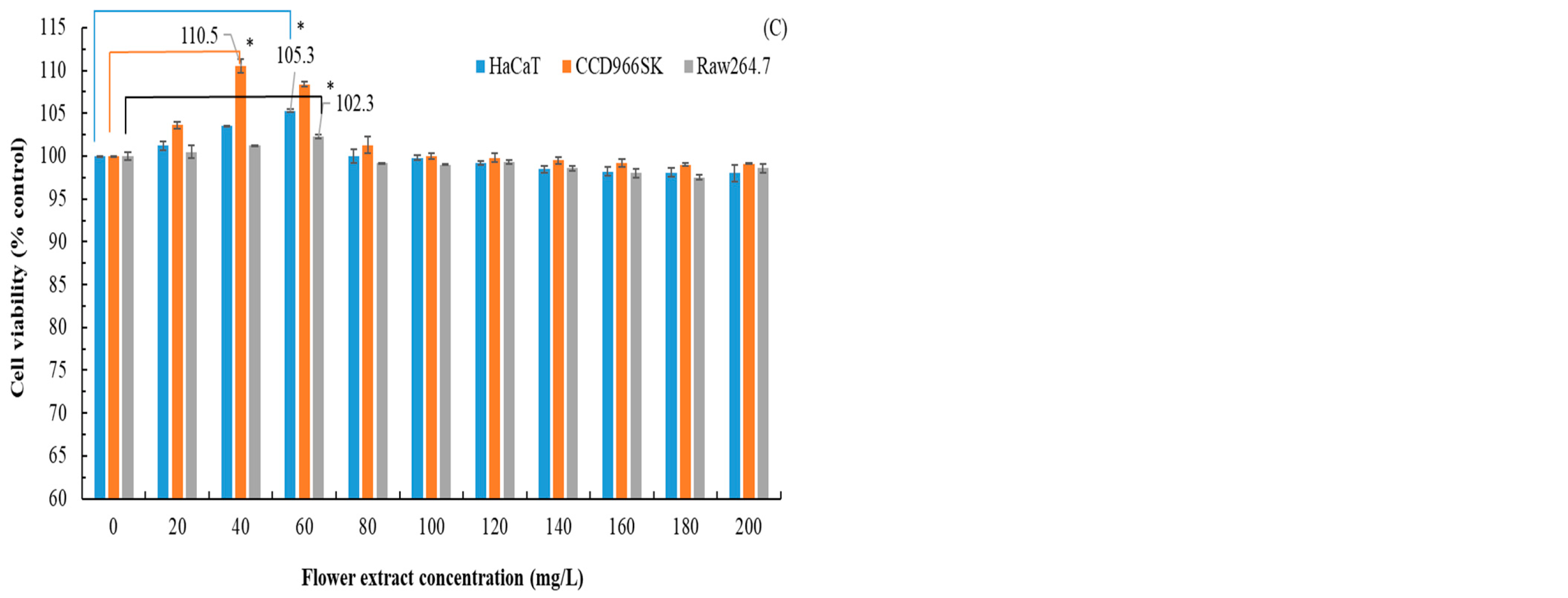 The significance of any pharmacological activity must be established under conditions that do not compromise cell survival. Therefore, assessing cytotoxicity or cell viability is essential. This study utilized four cell lines: HEMn (for melanin studies), CCD966SK (for antiaging activity and wound healing assays), Raw264.7 (for anti-inflammatory activity assays), and HaCaT (obtained from BCRC for wound healing assays). Cell viability assays were performed using the Cell Counting Kit-8 (CCK-8) (Dojindo, Kumamoto, Japan). Briefly, 104 cells/well were seeded into a 96-well microplate, and extracts from the flowers, leaves, or rhizomes of flatland P. cuspidatum were then added at various concentrations for a 48 h incubation. Subsequently, 10 μL of CCK-8 solution was added to each well and incubated at 37 °C for 4 h. Absorbance at 450 nm was then measured using an ELISA plate reader. Cell viability was calculated using the following formula: