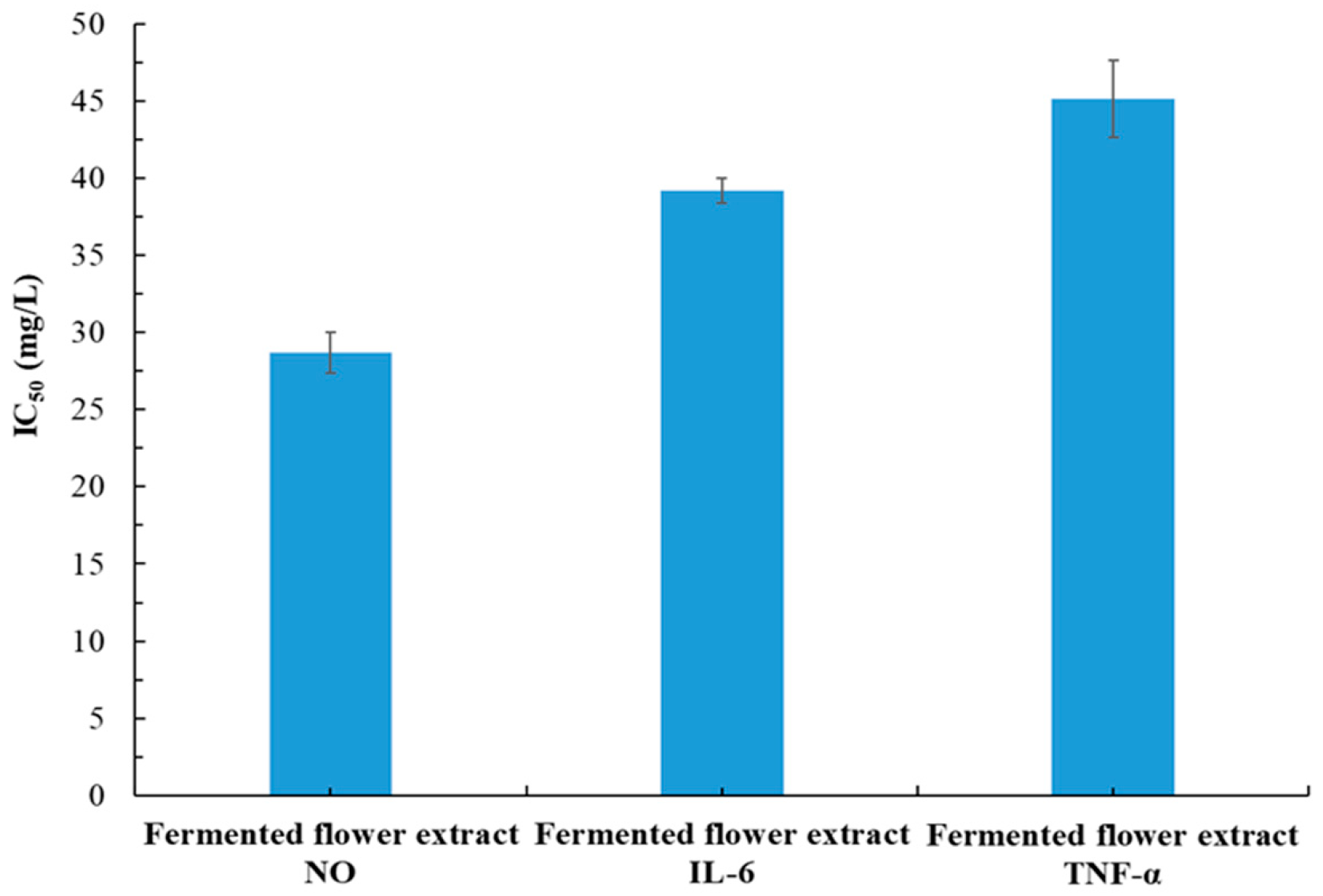 Figure 8. IC50 value of fermented flatland P. cuspidatum flower extract for its anti-inflammatory effect. Data are presented as the means and standard deviations of three independent experiments. This extract was produced using MAE under optimal conditions followed by fermentation with A. oryzae for 5 days.