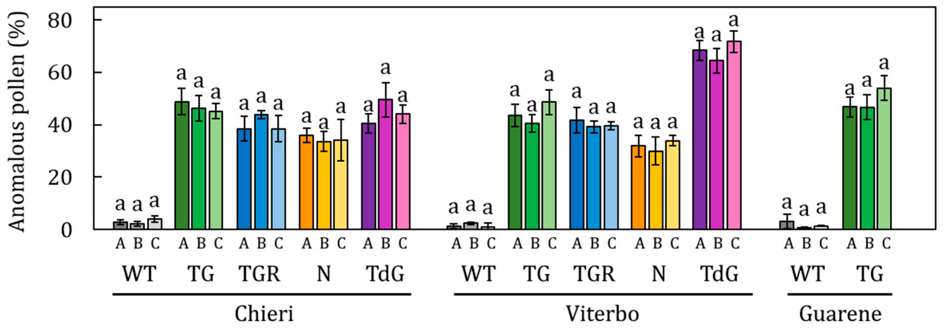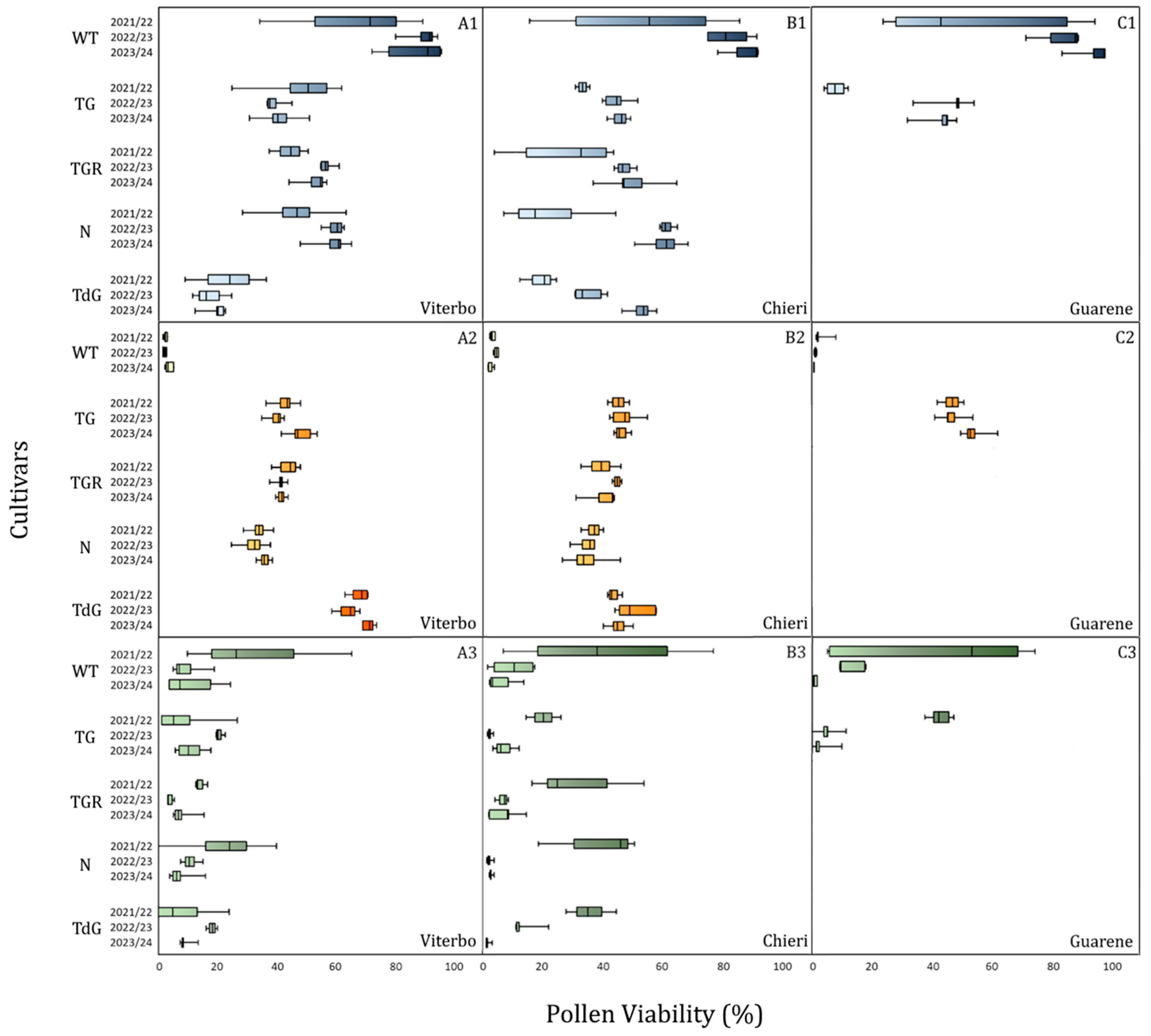 Brandoli C, Demasi S, Fochi V, Caccialupi G, Cristofori V, Silvestri C, Siniscalco C, Todeschini C, Sgarbi E. Pollen Viability and Anomalies in European Hazelnut: Cultivar Traits or Environmental Effect? Plants. 2025; 14(23):3576. https://doi.org/10.3390/plants14233576