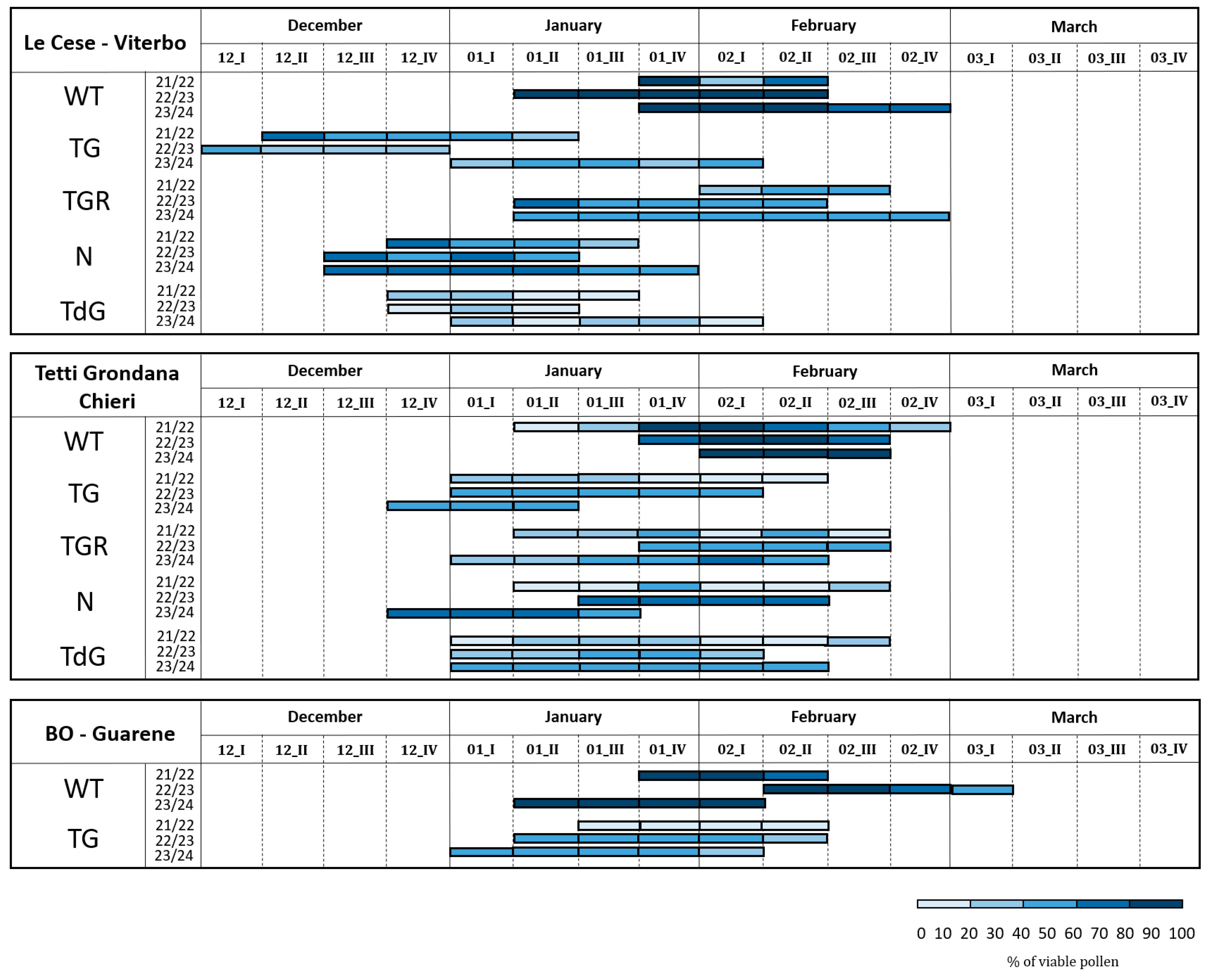 - Novara, C.; Ascari, L.; La Morgia, V.; Reale, L.; Genre, A.; Siniscalco, C. Viability and Germinability in Long Term Storage of Corylus avellana Pollen. Sci. Hortic. 2017, 214, 295–303. [Google Scholar] [CrossRef]