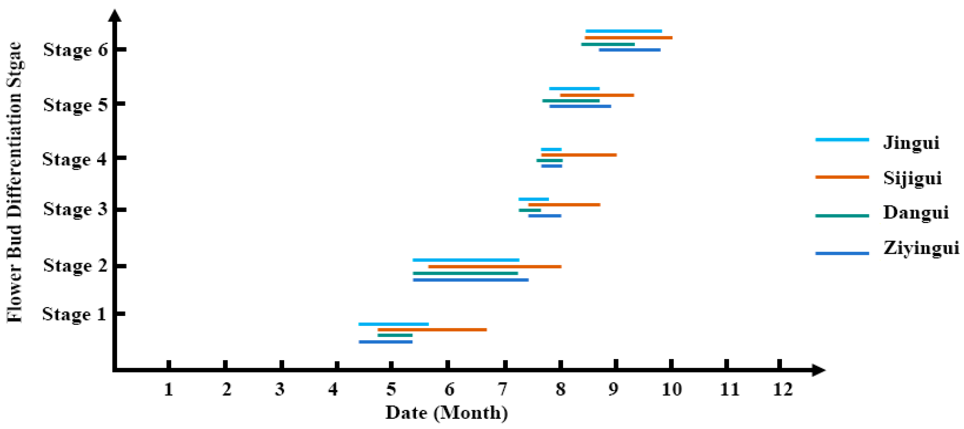 - Lu, T.; Wang, Y.G.; Luo, Y.B.; Zhang, C.; Fu, J.X.; Dong, B.; Hu, S.Q.; Zhao, H.B. Comparison on flower bud differentiation and development of different seasons of Osmanthus fragrans ‘Sijigui’. Acta Hortic. Sin. 2017, 44, 1145–1156. [Google Scholar]