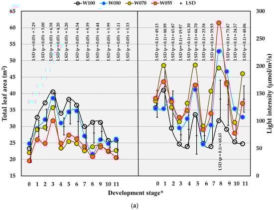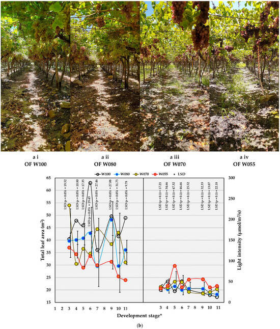 The effect of water (W) treatments on leaf area and light intensity in a Crimson Seedless vineyard grown under open field (OF) conditions from 2019/2020 to 2022/2023 (a) and overhead plastic covering conditions (OPC) from 2021/2022 to 2022/2023 (b) near Robertson, South Africa. * Development stages: 0 = full bloom, 1 = berry set, 2 = 6 to 11 DAFB (Days after full bloom), 3 = 20 to 25 DAFB, 4 = 34 to 39 DAFB, 5 = 48 to 53 DAFB, 6 = 62 DAFB, 7 = 67 to 77 DAFB, 8 = 78 to 81 DAFB, 9 = 83 to 88 DAFB, 10 = 90 to 95 DAFB, 11 = 97 to 102. W100 (100% = commercial practice), W080 (80% of commercial practice), W070 (70% of commercial practice), W055 (55% of commercial practice). LSD = Least significant difference.