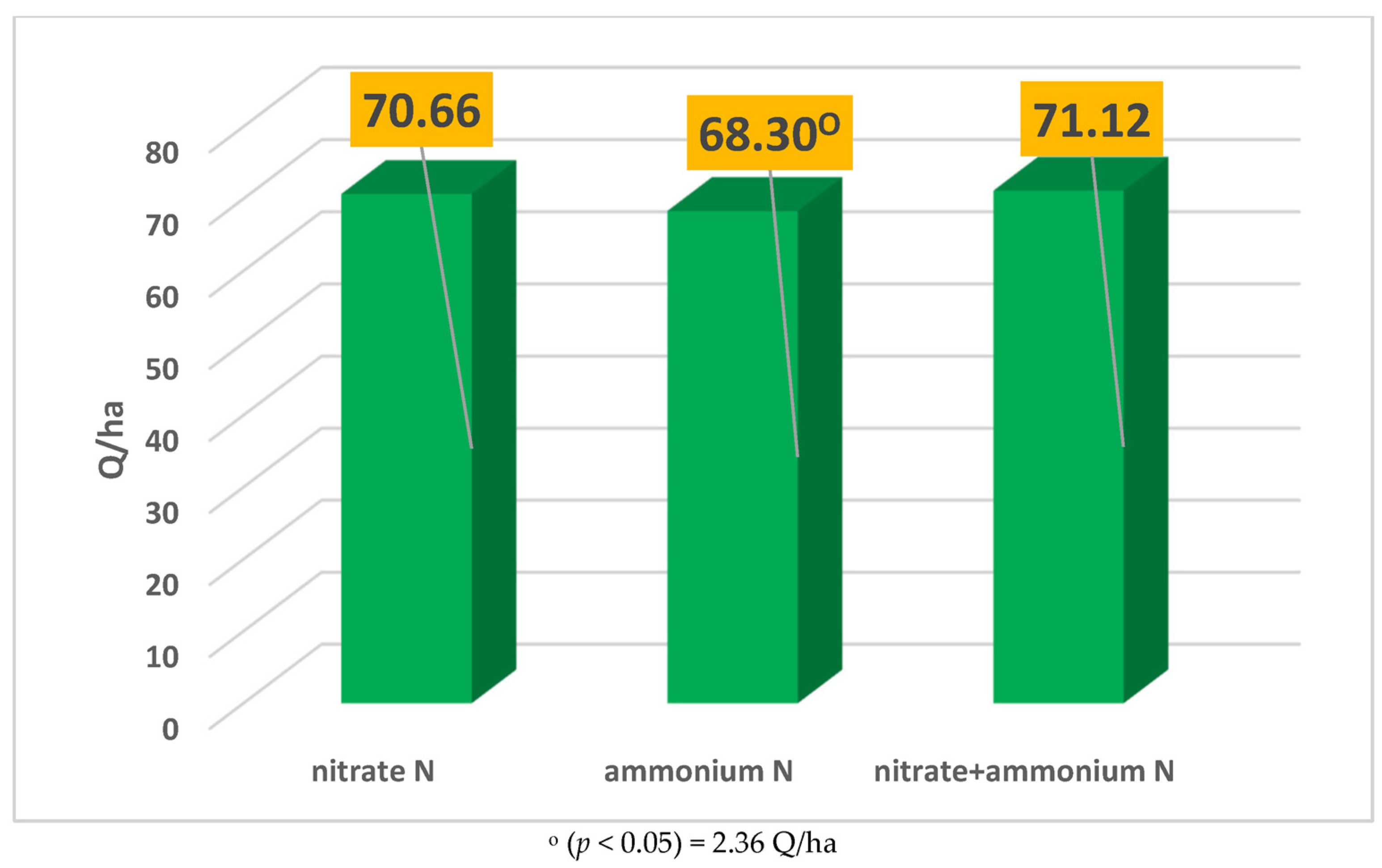 2.2. The Effect of Nitrogen Form (Factor B) on Yield