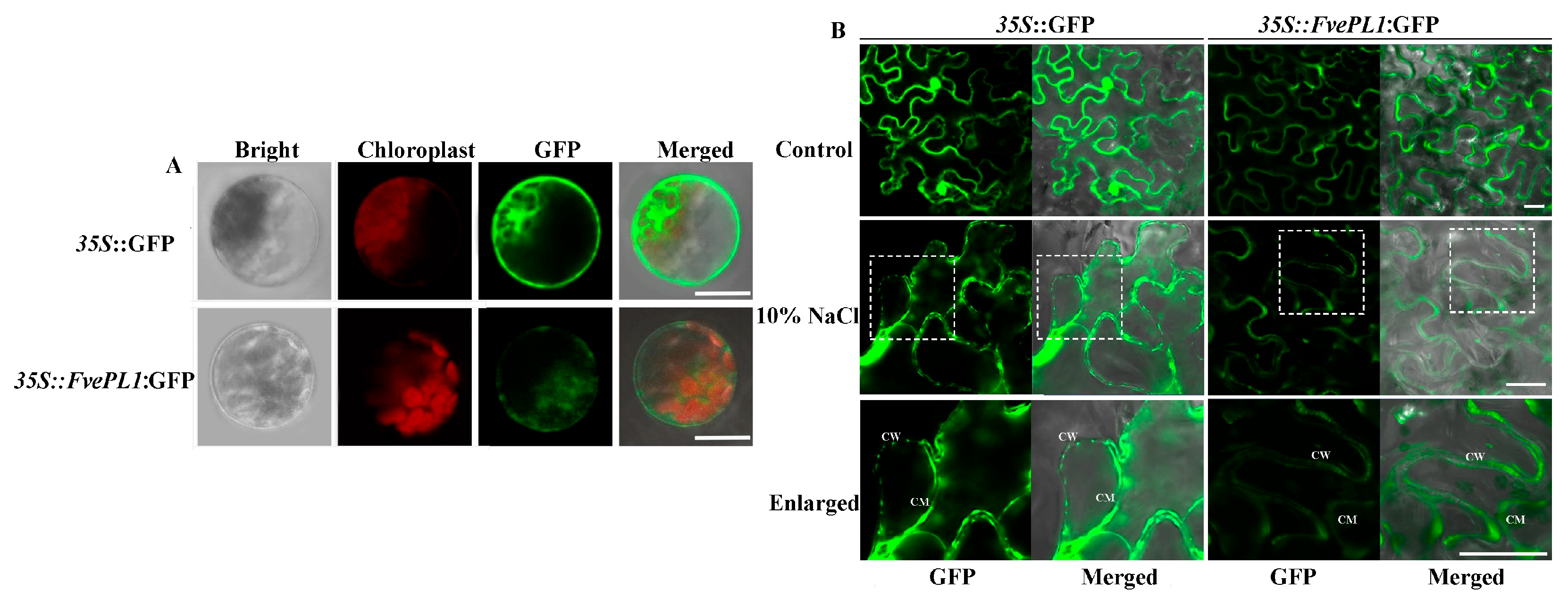 2.2. FvePL1 Was Localized in Cell Wall, Cell Membrane and Cytoplasm