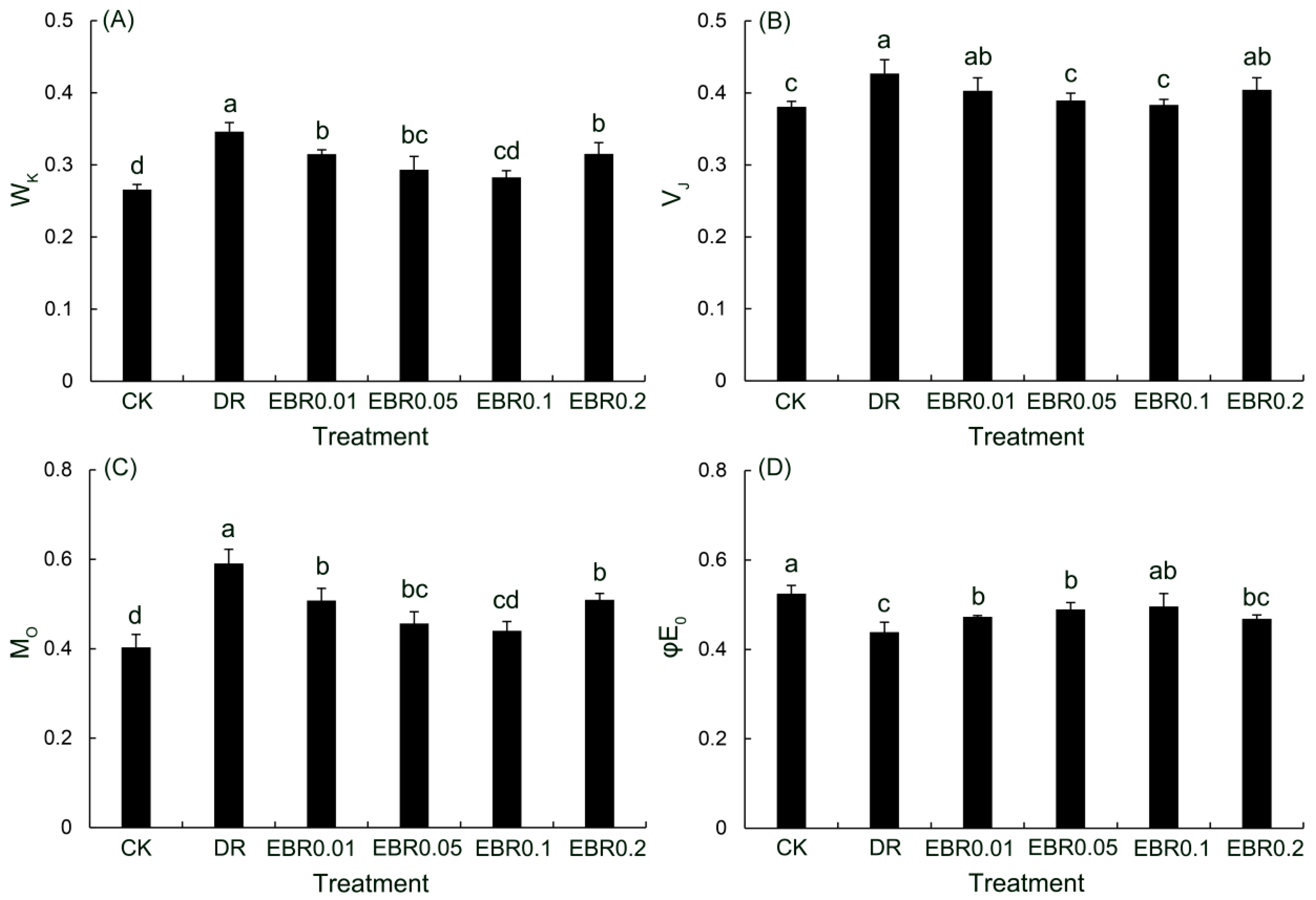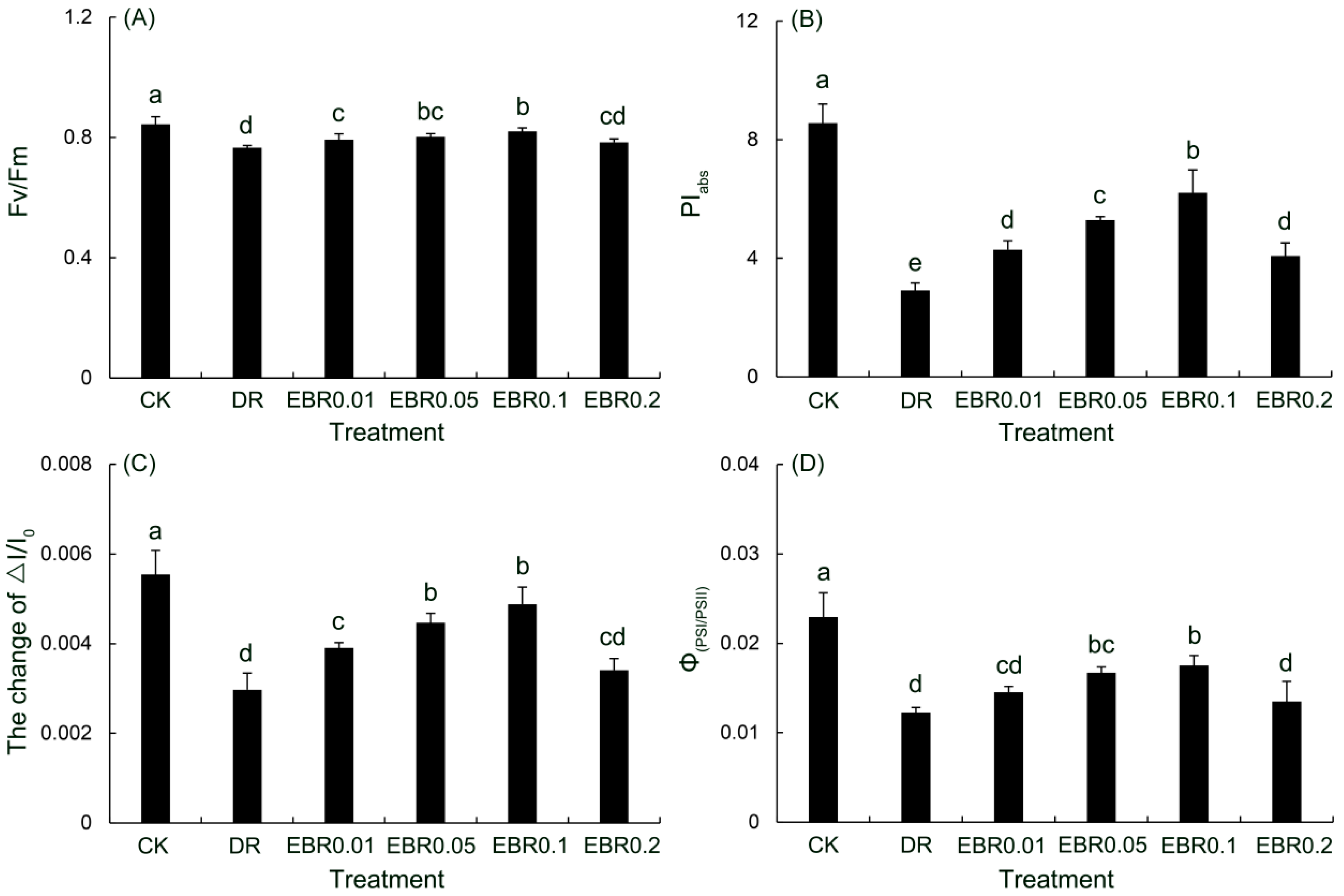 3.2. Effects of EBR on Photosynthetic and Chlorophyll Fluorescence Parameters