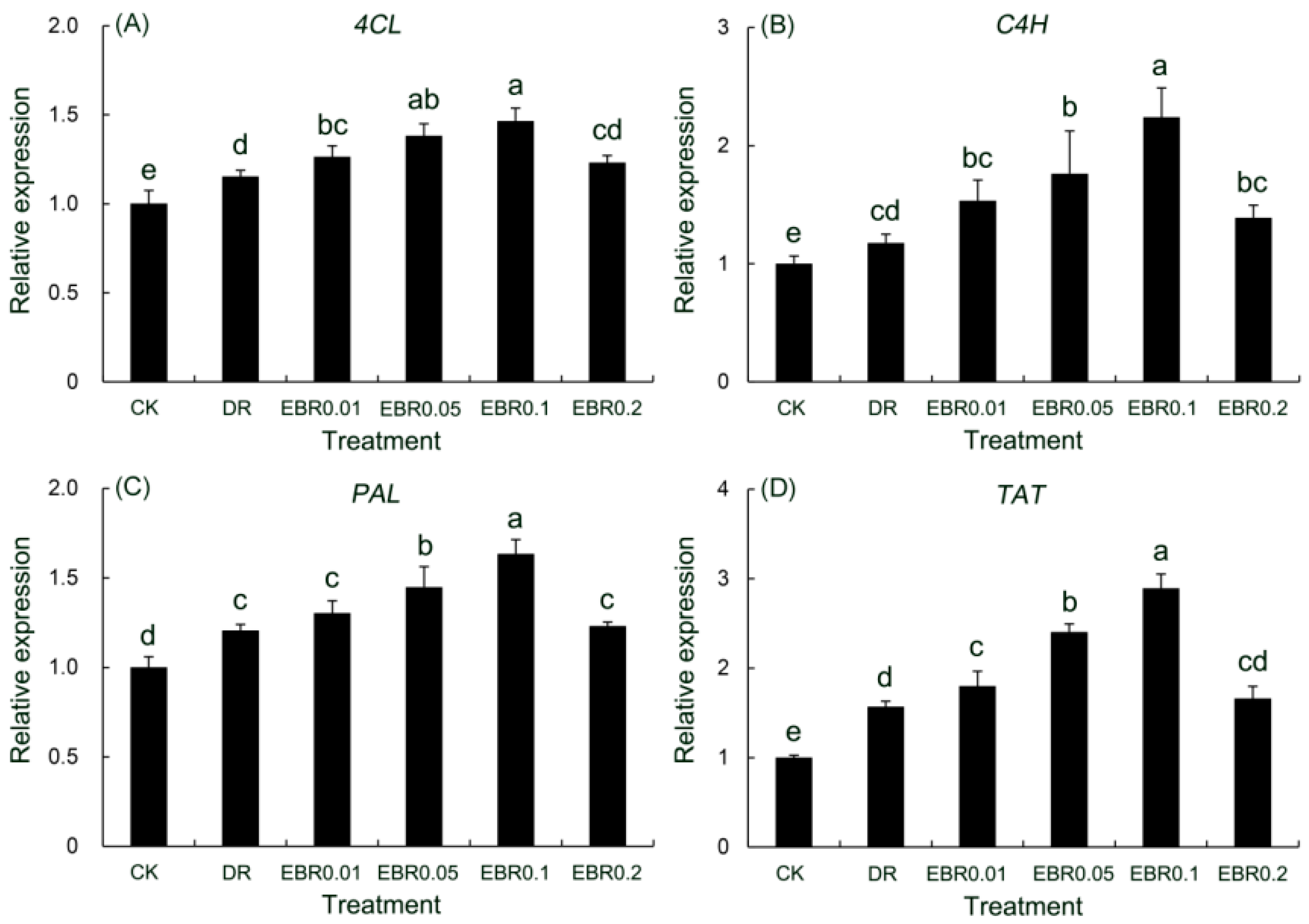 3.4. The Effects of EBR on Secondary Metabolites and Related Gene Expression