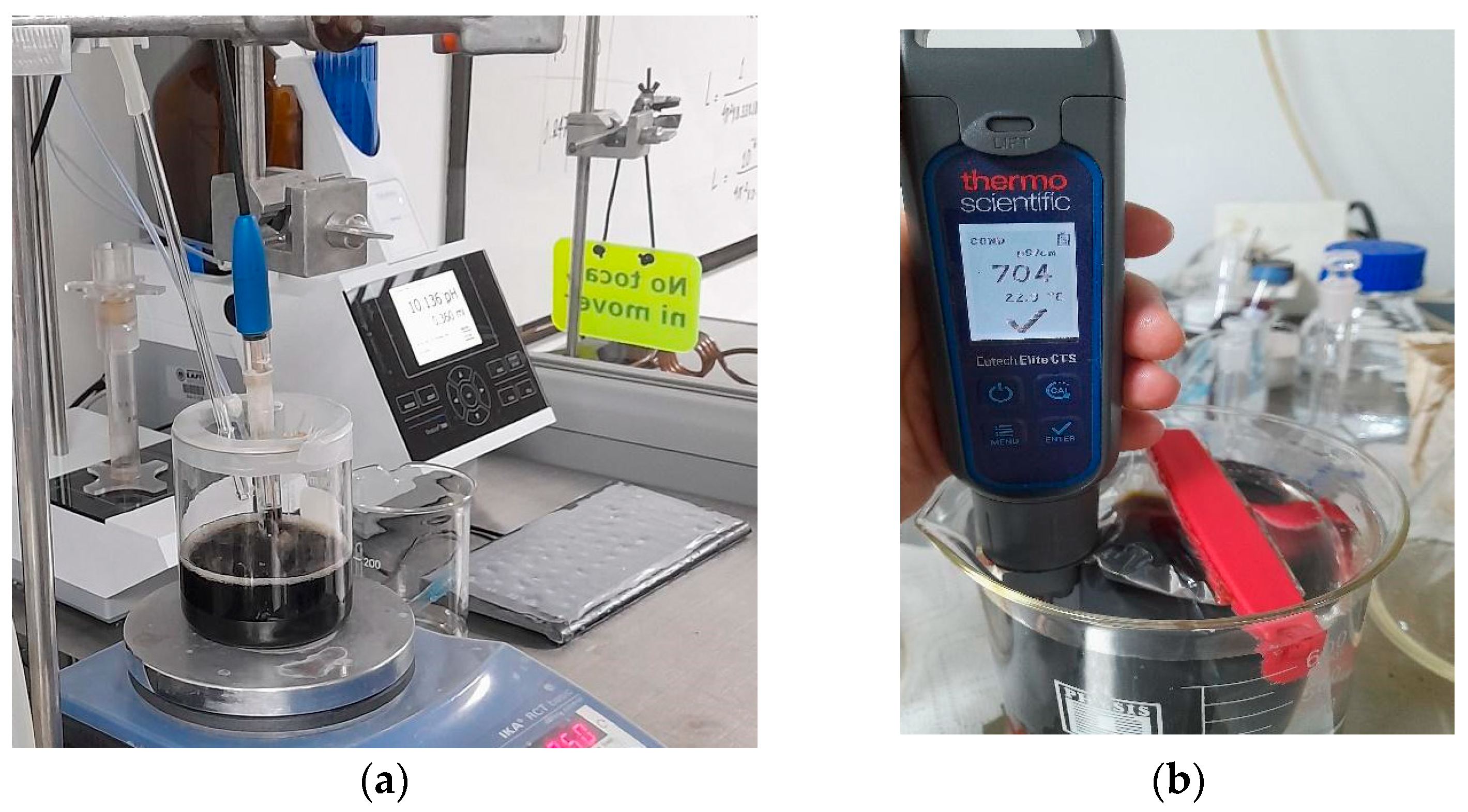 Figure 1. Synthesis of the nanocomposites: (a) View of the suspension of MNPs functionalized with chitosan and phosphates, (b) View of the washing of MNPs by dialysis.