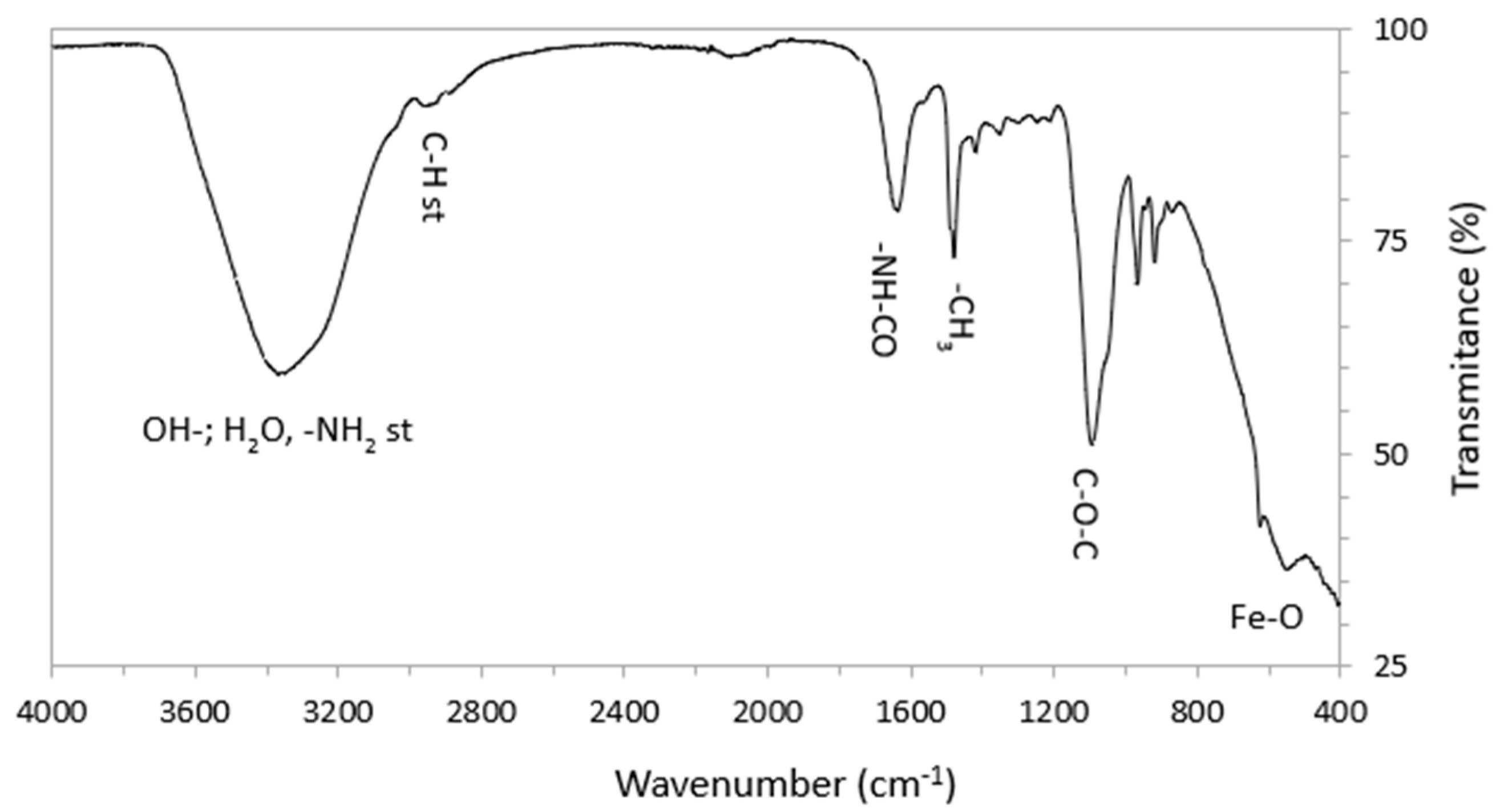 Figure 3 presents the infrared spectrum of the nanocomposite; this spectrum exhibits several bands characteristic of Fe-O bonds at tetrahedral and octahedral sites of magnetite–maghemite, as well as polysaccharide chains of chitosan, among them Ether (C-O-C), Amide (-NH-CO) and C-H. This spectrum also shows a band located around 1478 cm−1, characteristic of the methyl group (-CH3). The presence of the methyl group evidences the quaternization of the chitosan bonded to the surface of the spinel nanoparticles.