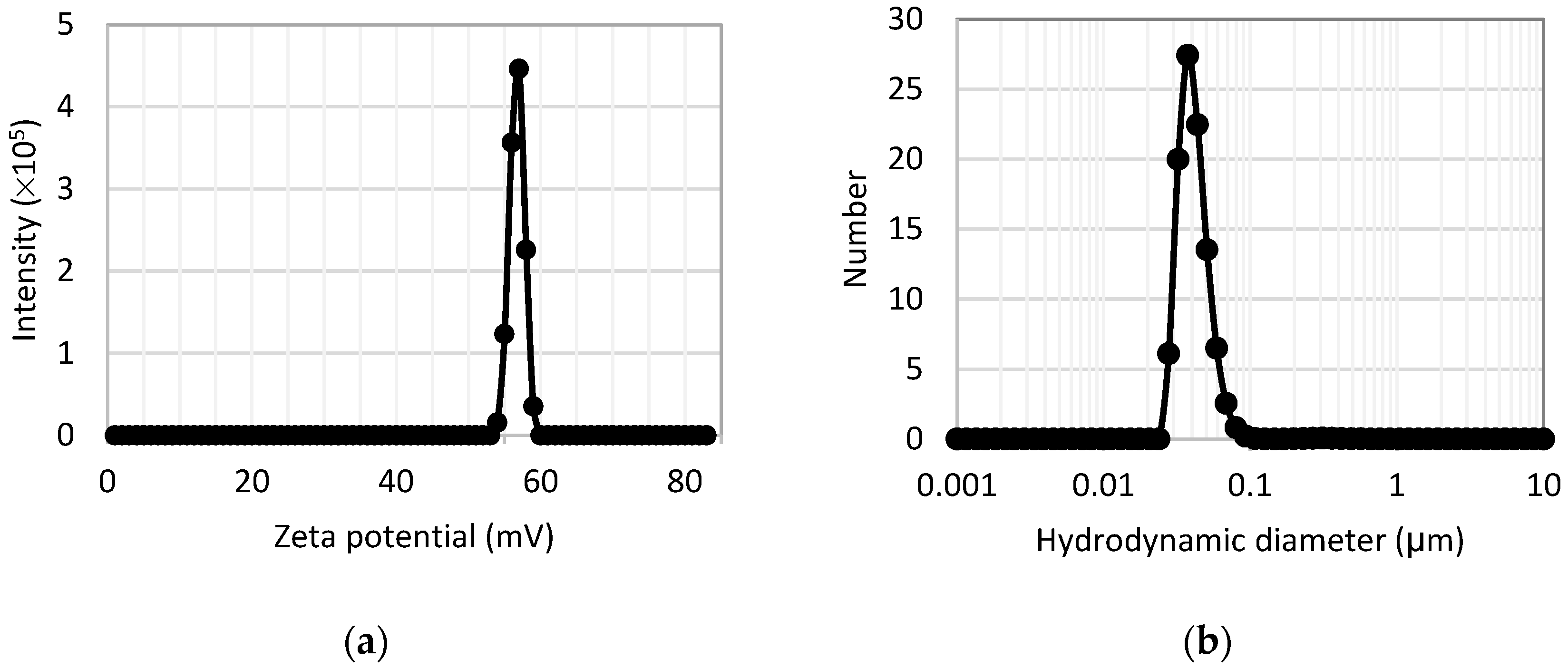 Figure 4. (a) Zeta potential measurement of the aqueous suspension of nanocomposite; (b) percentage number of particles per hydrodynamic diameter. Black dots represent experimental data, while solid curves represent interpolated experimental data.