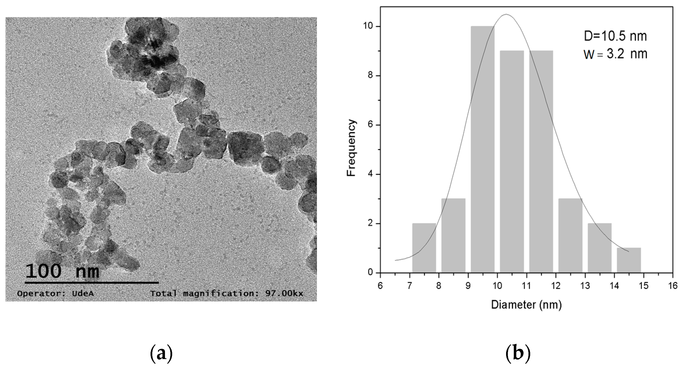 Figure 5 presents a TEM micrograph of the nanocomposite obtained and its particle size distribution, respectively. As can be seen from the micrograph, the particles exhibit low aggregation and a nearly spherical morphology, with a mean particle size around 10 nm, estimated by the lognormal fitting of the particle size distribution.