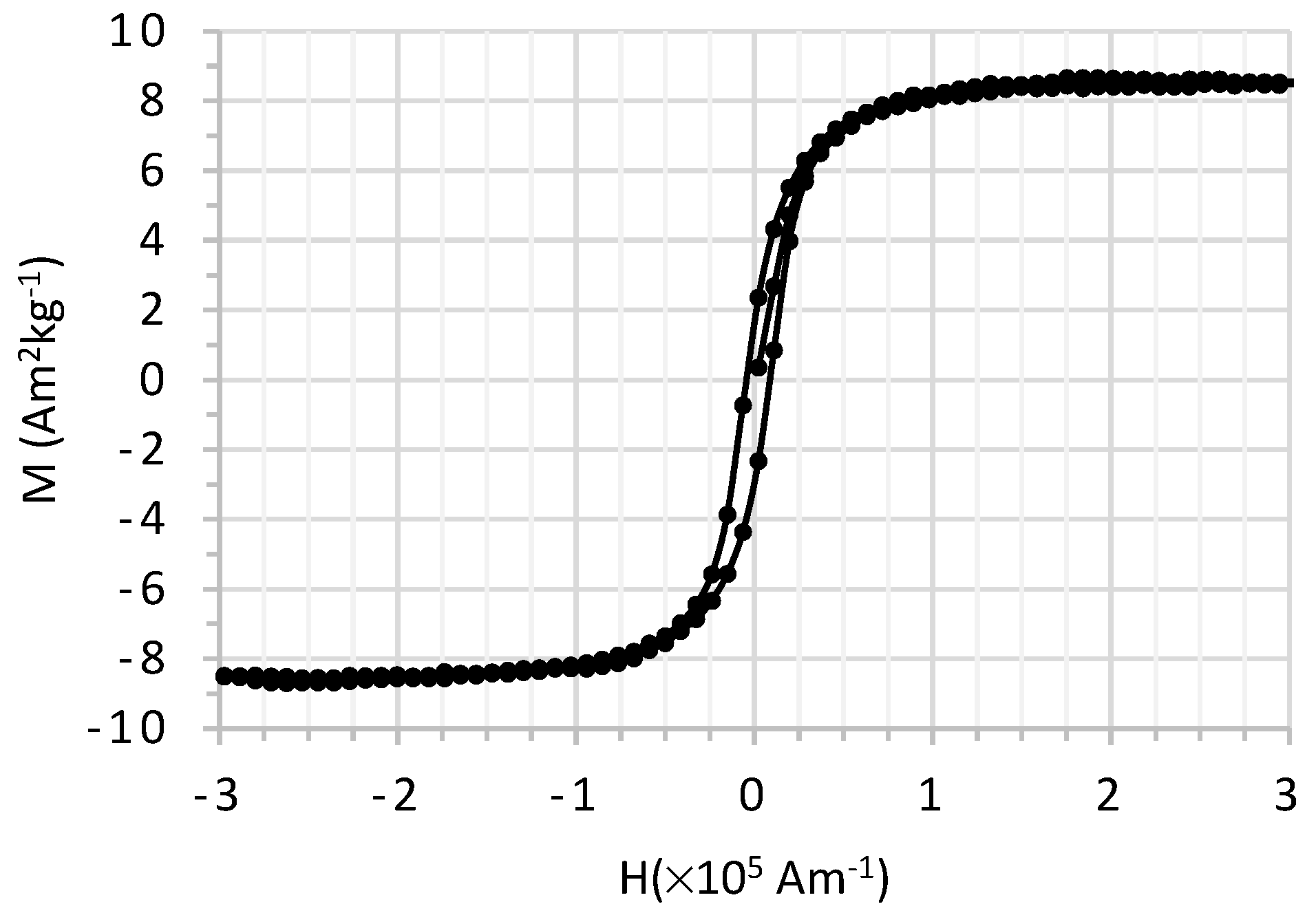 The room temperature magnetization curve of the nanocomposite, presented in Figure 6, is characteristic of soft magnetic materials. The sample saturated at a magnetic field of 200 kAm−1 approximately.