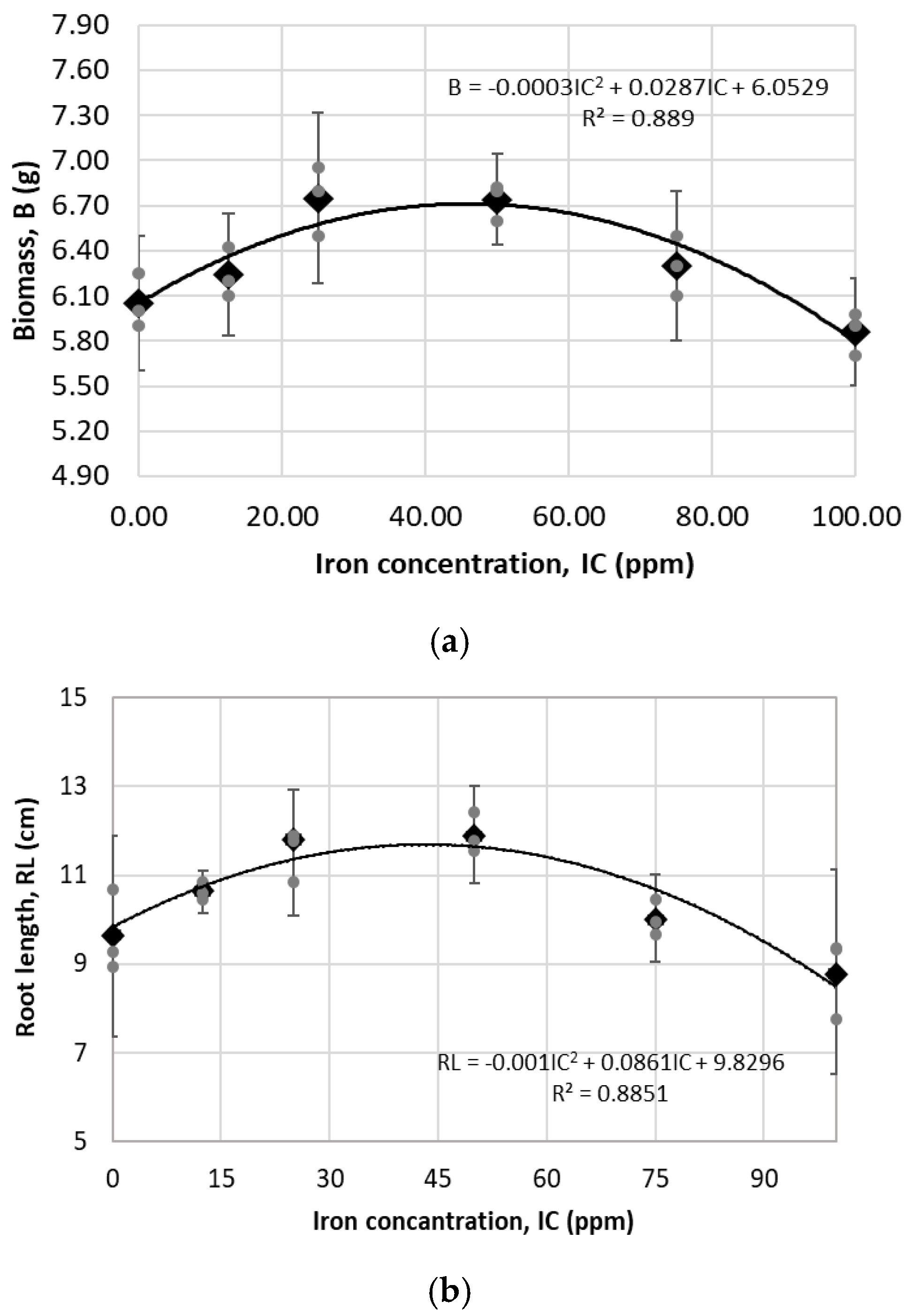 Figure 8. Regression analysis of different iron concentrations in germination of maize seeds: (a) Evaluation of variable Biomass (polynomial model grade 2, ANOVA of model: 0.037), (b) Evaluation of variable root length (polynomial model grade 2, ANOVA of model: 0.039). Gray dots represent raw replicate points, black dots represent the mean, and bars indicate the margin of error with 95% confidence intervals, calculated with Student’s t-test.