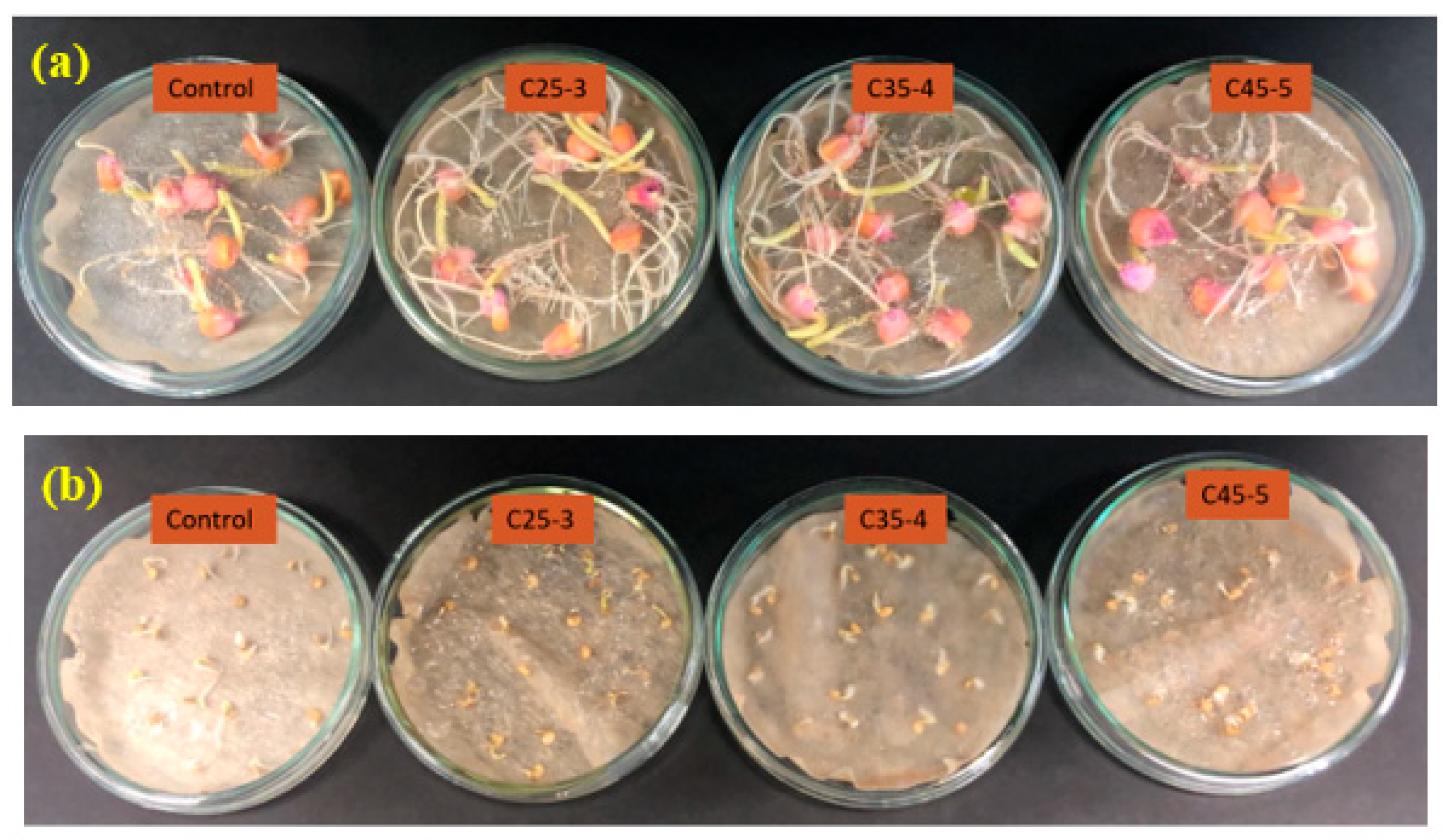 As a result of this assay, neither the germination percentage (Figure 10a,b) nor the root length (Figure 10c,d) showed statistically significant differences between the treated seeds and the control, as determined by ANOVA at a 95% confidence level. However, only maize treatments C35-4 and C45-5 showed statistically significant differences between them in the germination percentage.