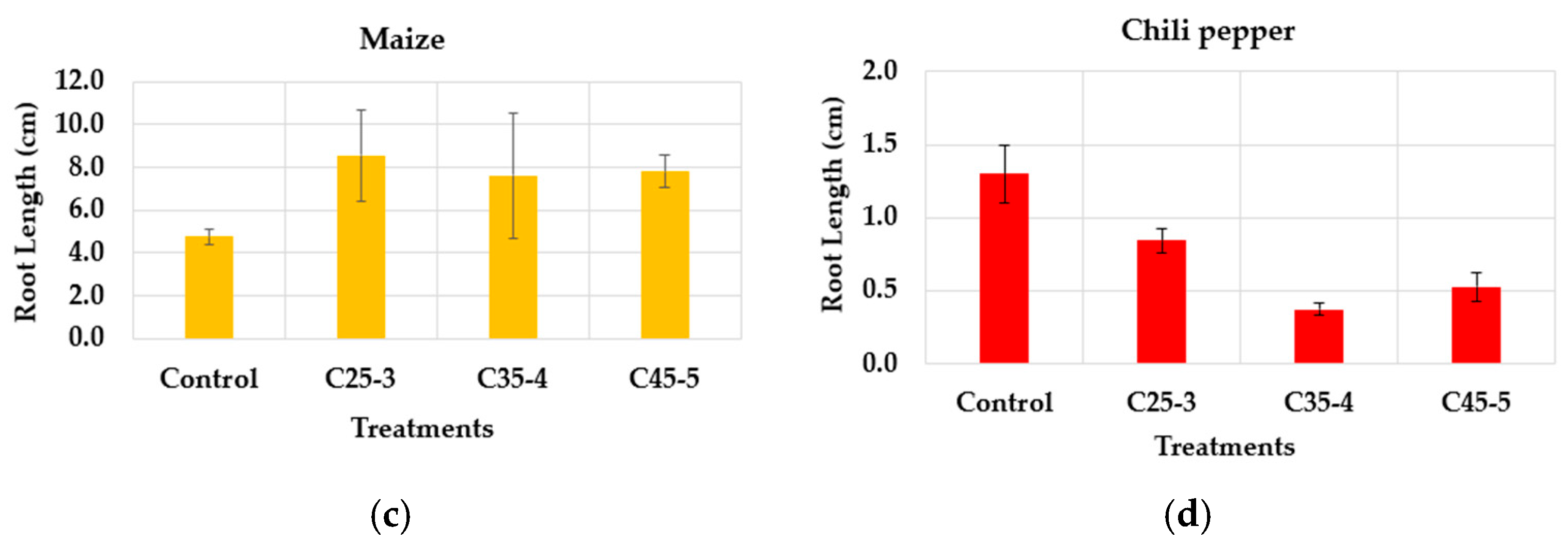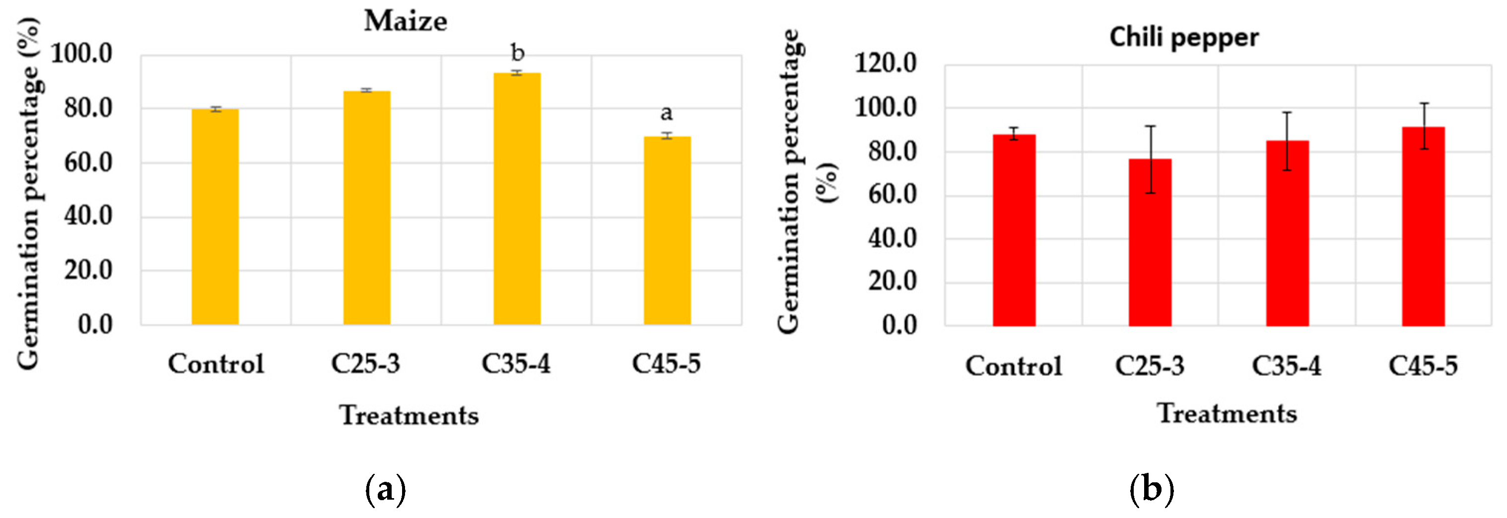 According to Figure 10a, the germination percentage of the maize seeds showed a value of over 70%, with the C45-5 treatment having the lowest value (70%) and the C35-4 treatment the highest (93%), while the chili pepper seeds had a value of over 77%, with the C45-5 treatment having the highest value (92%) and the C25-3 treatment the lowest value (77%). Although the results of germination percentage of both crops suggest that there is no presence of phytotoxic effects on the treated seeds at the morpho-anatomical level, as no statistically significant differences are observed between the treatments with respect to the control, and in addition to this, they reached a value of over 50% germination, which classifies them as seeds with good viability [36], a reduction is evident in the germination percentage observed in maize compared to the first assay. Considering that light, temperature, and the internal conditions of each seed are relevant factors in the germination process [37,38], one possible reason for the difference between the two trials was that the two germination trials were conducted with different batches of maize seeds, supplied sequentially by the supplier as our experimental work progressed.