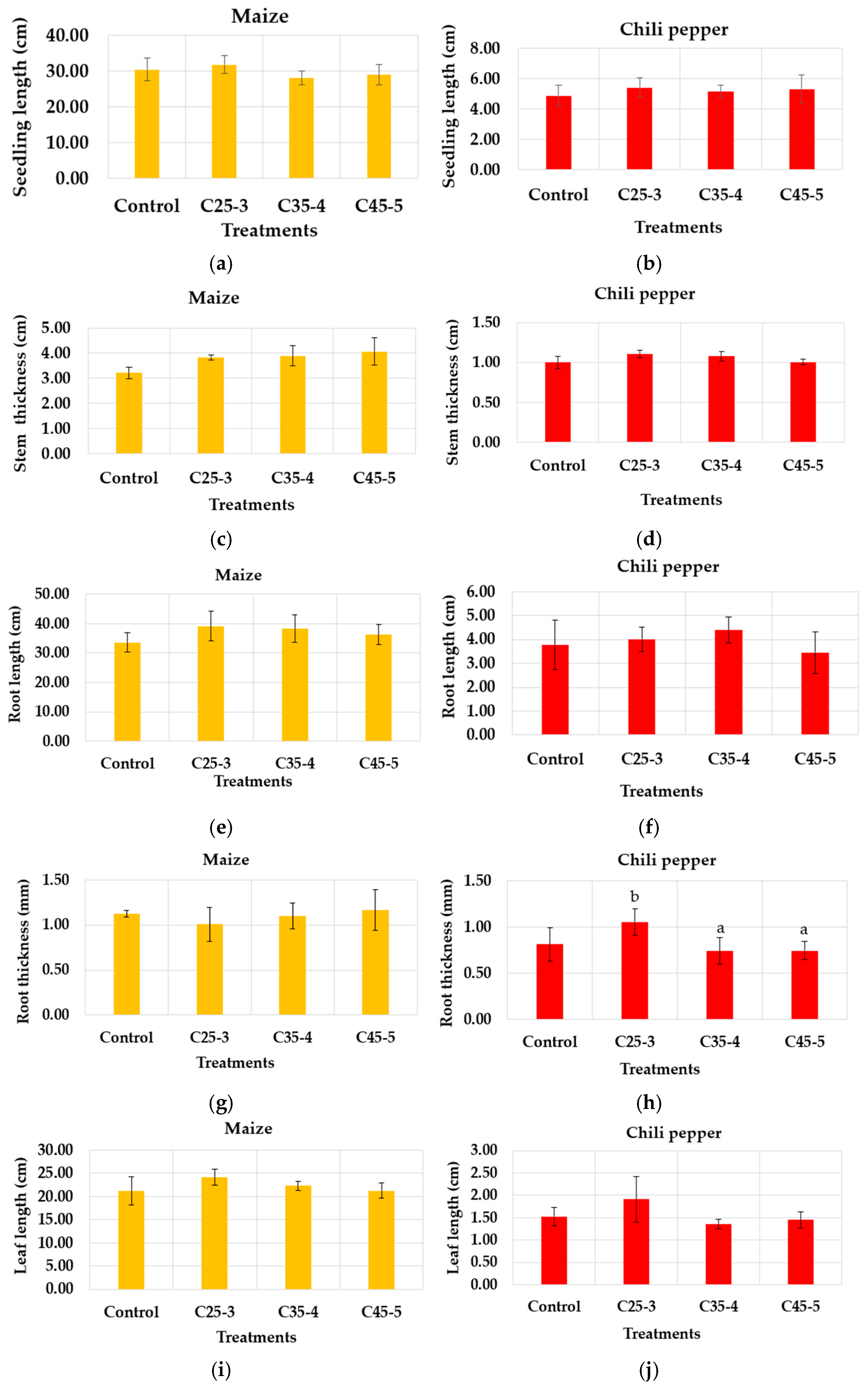 To monitor the growth of the seedlings coming from the seeds treated with the nanocomposite suspension and evaluate the effect of these on the physiological level, maize and chili pepper seeds germinated under the C25-3, C35-4, C45-5 and control treatments in the second in vitro assay were sown in commercial soil, where they grew under greenhouse conditions. During this period, the seedlings were watered daily, as mentioned in the methodology Section 2.9, and constantly monitored to ensure they did not suffer from any pests or diseases that could affect their growth. After 28 days of growth, the seedlings were removed from the pots and the following measurements were taken: seedling length, stem thickness, root length, root thickness, length of the longest leaf, and dry biomass (Figure 11).