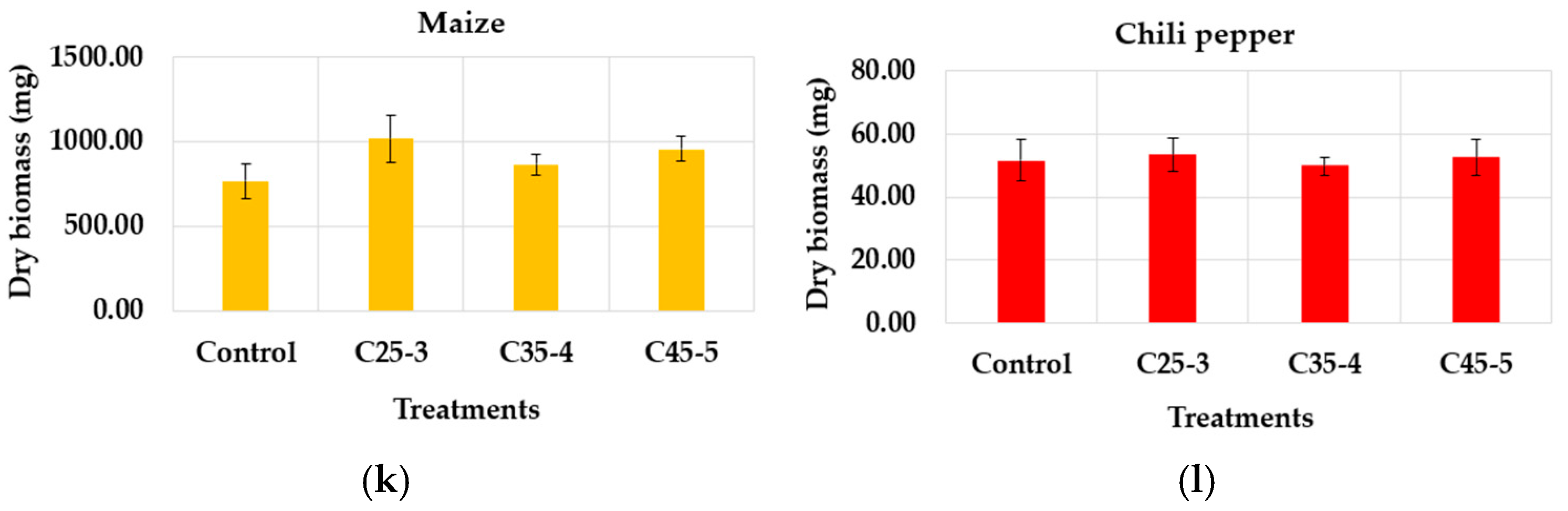Germinated seeds in the in vitro assay, treated with suspensions C25-3, C35-4, and C45-5, were sown in pots and seedling trays with a black commercial soil (mixture of organic soil, decomposed plant matter, and essential minerals; obtained from Tierragro) for maize and chili pepper, respectively. For maize, we prepared three pots per treatment, with three germinated seeds in each one, while in the seedling trays, we prepared three chili pepper seeds per cell, with four cells per treatment. Both crops were incubated in a greenhouse at an average temperature of 28 °C for 28 days, watered once a day at 9 a.m. with 250 mL of tap water per maize pot and 100 mL per chili pepper seedling tray, and at the end of the day, the soil was checked to ensure it was not dry. After this time, the maize and chili pepper seedlings were harvested, and the following measurements were performed: dry biomass (mg), root length (cm), root thickness (mm), stem thickness (mm), seedling height (cm), and length of the largest leaf (cm).