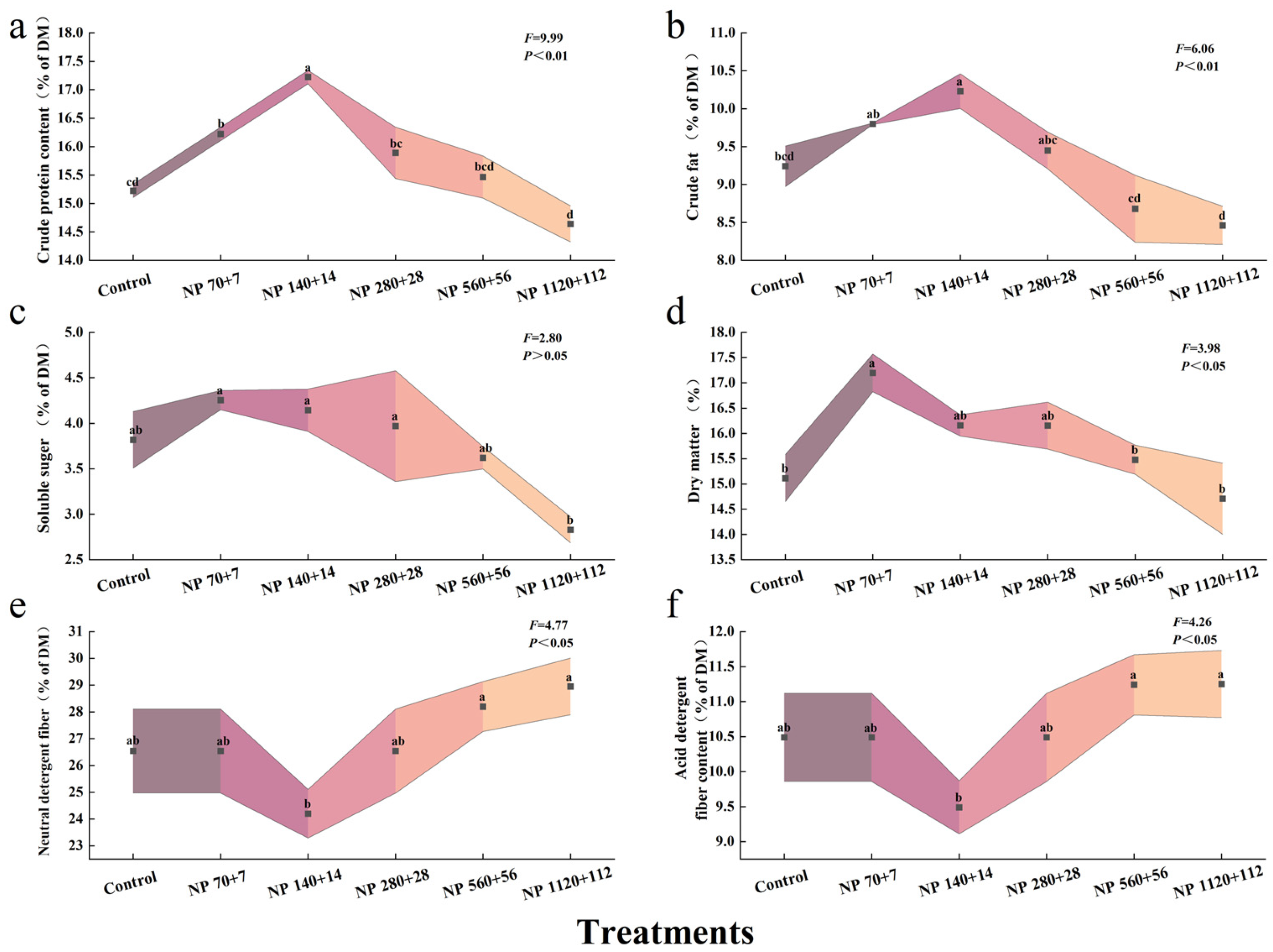 Ether extract content followed a similar pattern, increasing by 6.1% and 10.7% under NP 70 + 7 and NP 140 + 14, respectively, but decreasing by 6.1% and 8.4% at NP 560 + 56 and NP 1120 + 112, respectively (