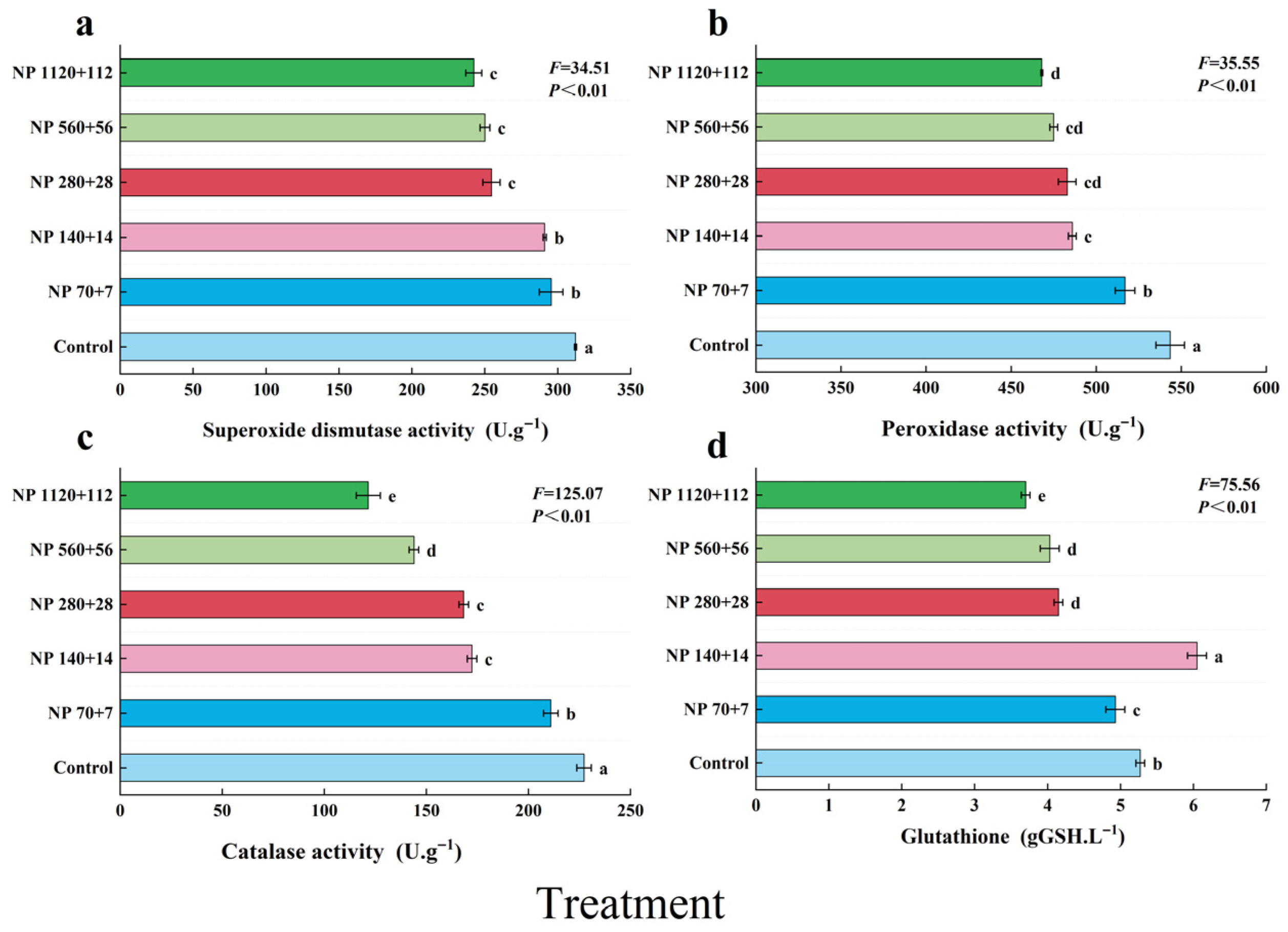 Figure 4b), and CAT activity by −7.2% to −46.5%, with the steepest decline in CAT under NP 1120 + 112 (