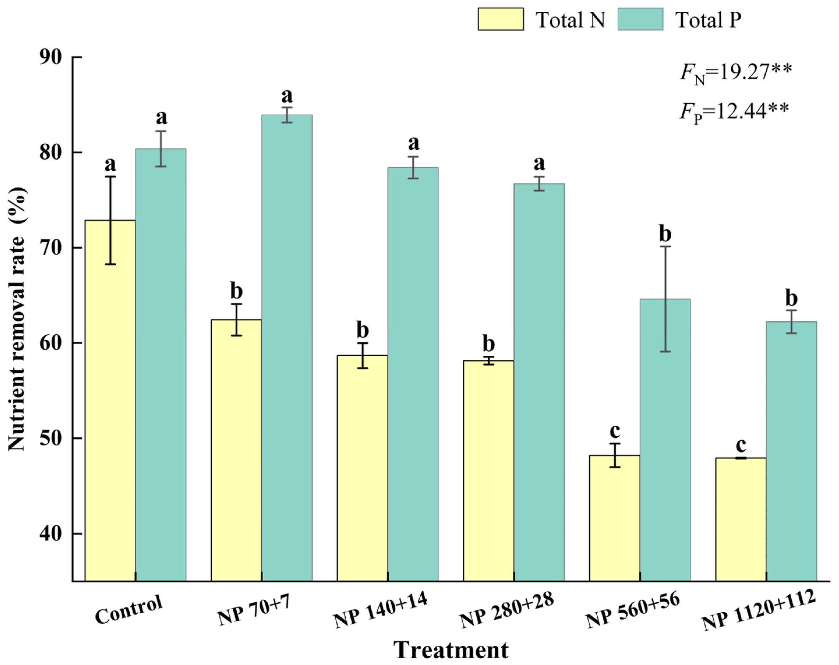 Similarly, phosphorus removal was highest at NP 70 + 7 and significantly declined at NP 560 + 56 and NP 1120 + 112. Together, these results suggest that barley seedlings are more effective in nitrogen uptake under moderate eutrophic conditions; however, phosphorus uptake efficiency diminishes progressively as external nutrient concentrations increase.