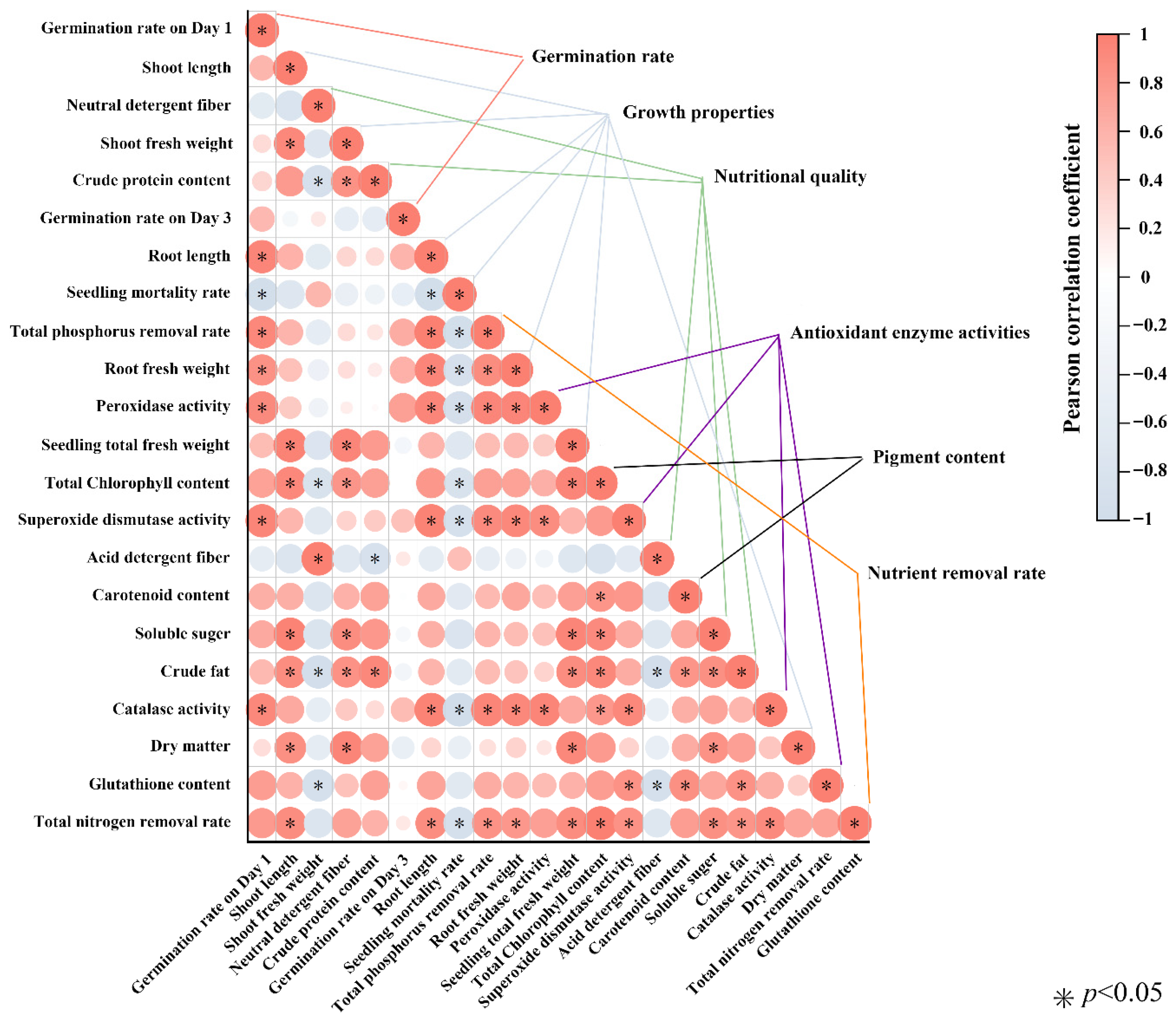 To further explore the relationships among growth performance, nutritional quality, photosynthetic pigments, antioxidant defense, and nutrient removal efficiency under different nitrogen and phosphorus treatments, a Pearson correlation analysis was performed (