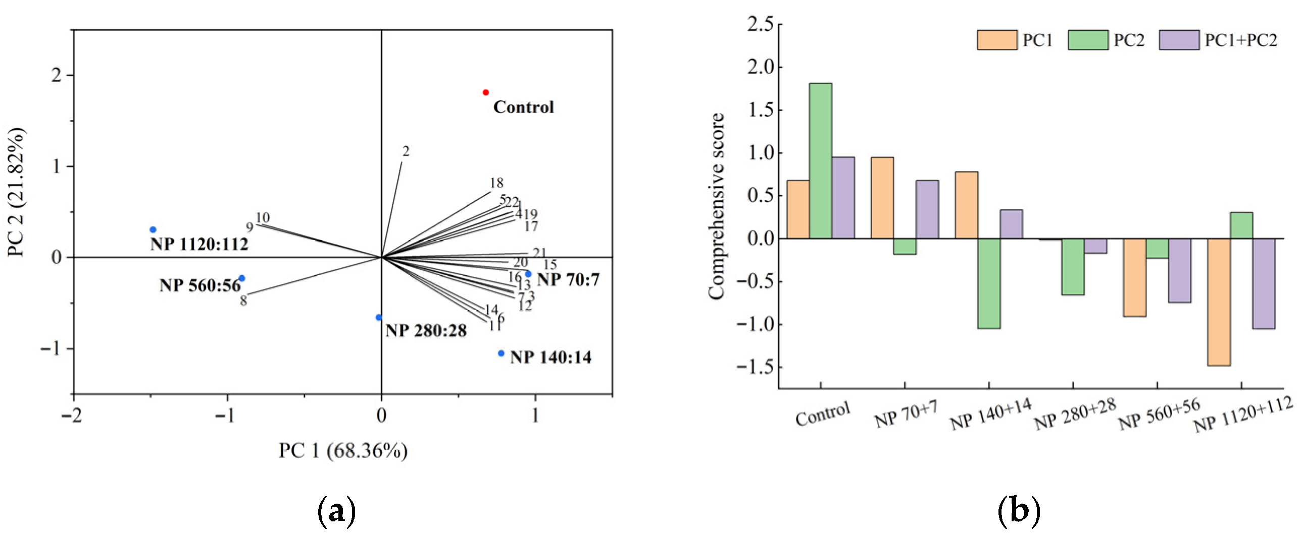 Figure 3). Both chlorophyll a and b followed a unimodal trend, increasing at lower nutrient levels and declining sharply at high concentrations. Compared with the control, chlorophyll a increased by 10.6% under NP 70 + 7 but declined by −8.5% to −23.4% across higher treatments. Similarly, chlorophyll b increased by 9.5% under NP 70 + 7 and reached a maximum of 15.9% under NP 140 + 14 and then declined to −28.6% under NP 1120 + 112.
