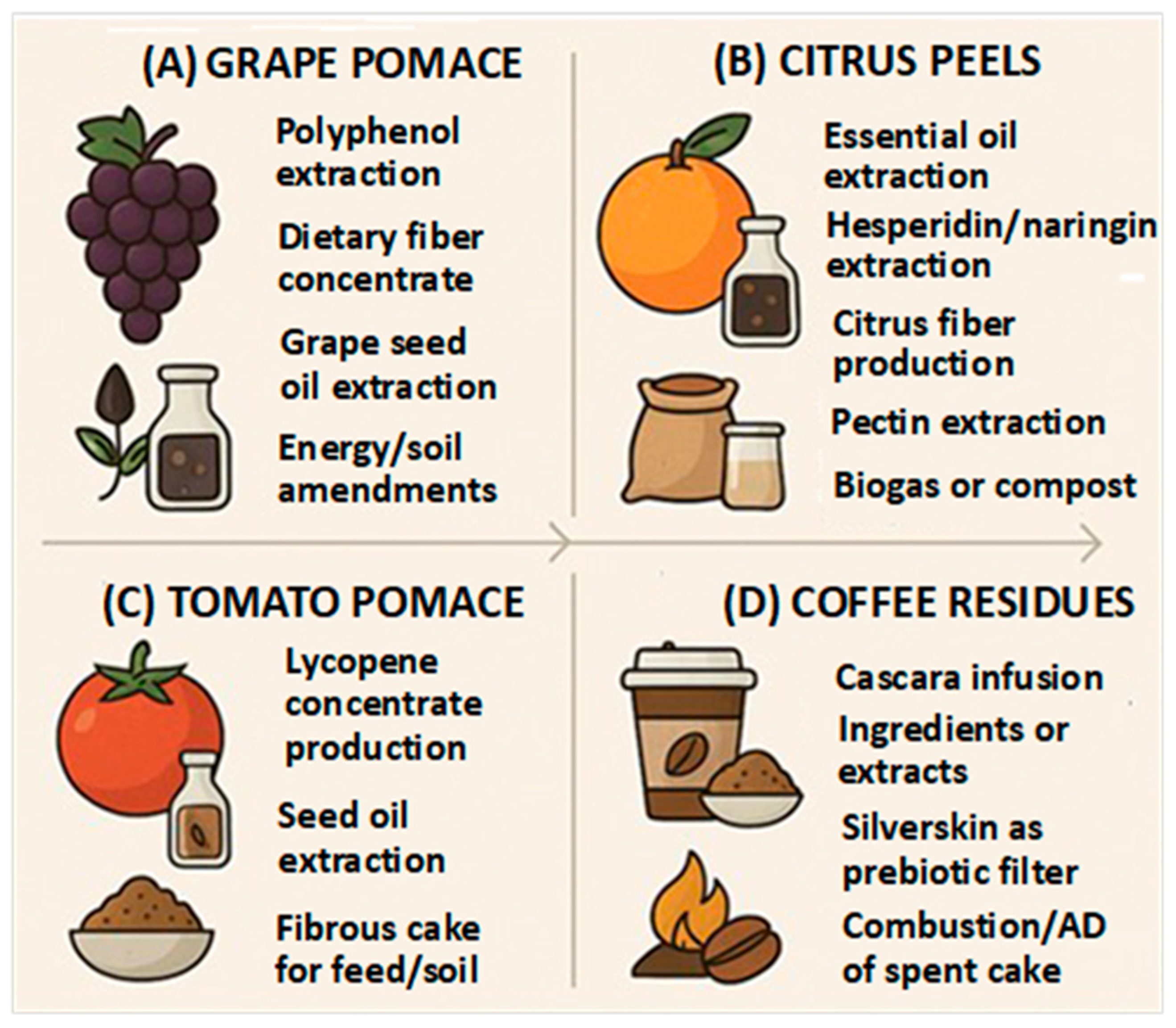 | Food and beverages | Extracts can serve as natural antioxidants, color stabilizers (e.g., lycopene from tomato pomace, anthocyanins from berry pomace), texturizers (e.g., citrus fiber, pectins from fruit peels), and prebiotic ingredients (e.g., silverskin from coffee, bran from grains) |