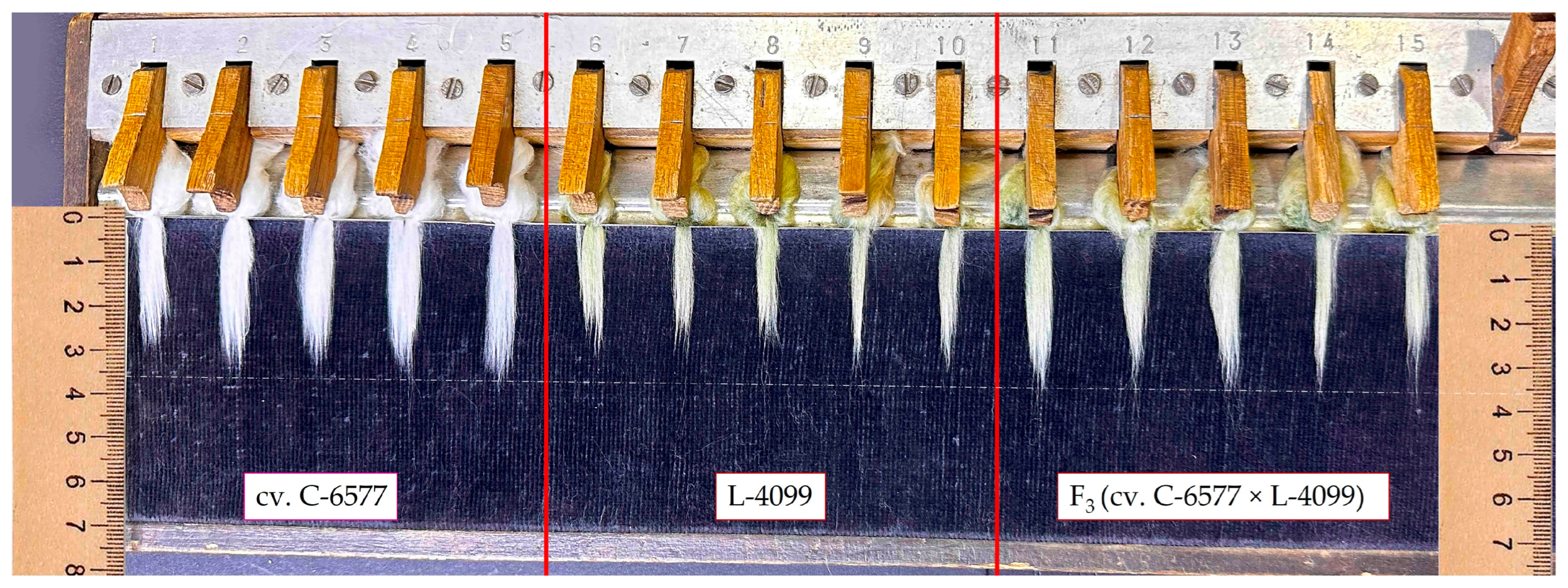 Figure 2). Upper half mean length (UHML) ranged from 21.9 mm, recorded in a brown-fiber line, to 35.4 mm in a white-fiber cultivar, with a population mean of approximately 26.0 mm. Fiber bundle strength varied from 23.3 g·tex