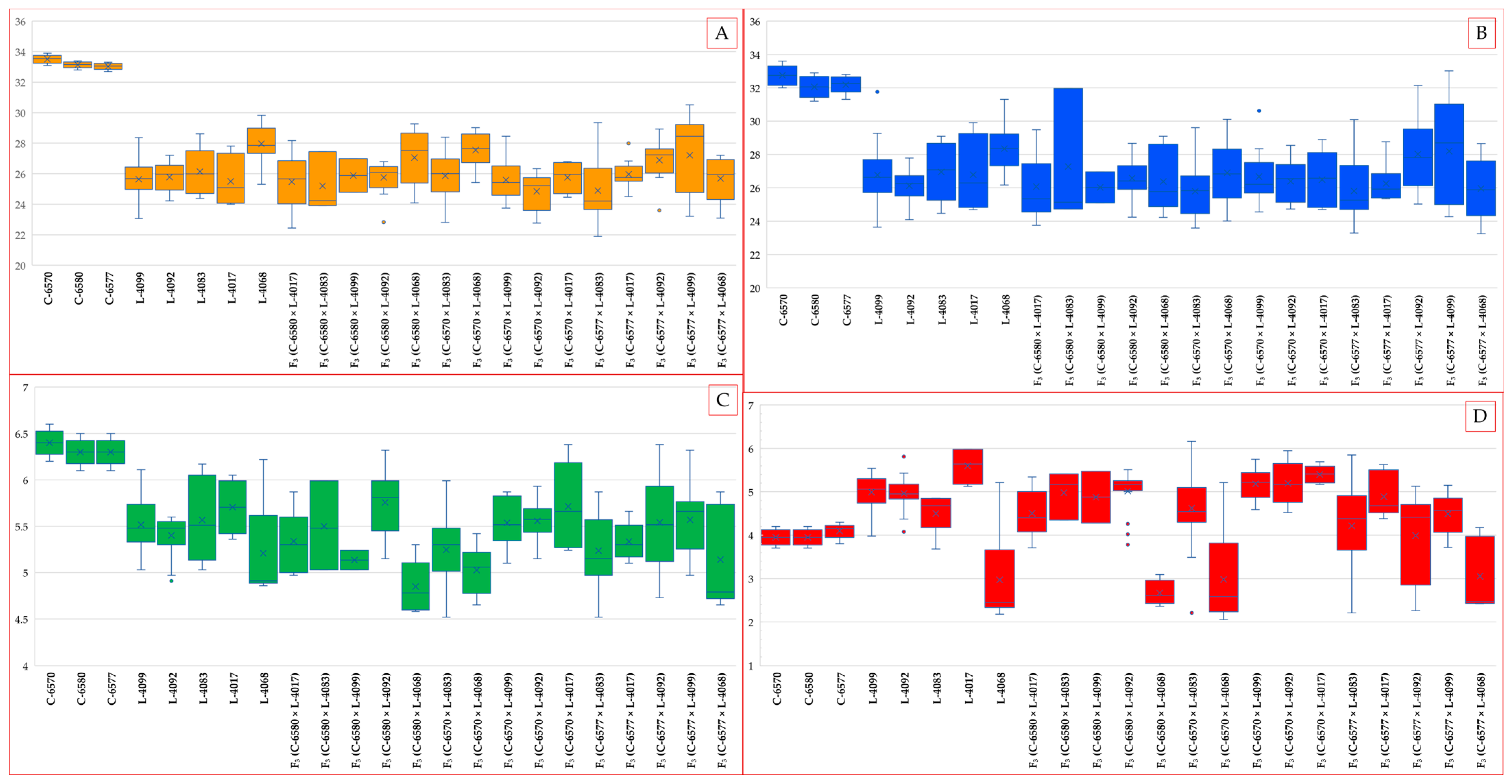 Figure 3). Several hybrids demonstrated substantial improvements over their colored parents, and some approached the performance levels of the elite white cultivars. These enhancements may partly reflect residual heterosis typical of segregating generations, and further evaluation of stabilized lines will be necessary to confirm their true genetic potential.