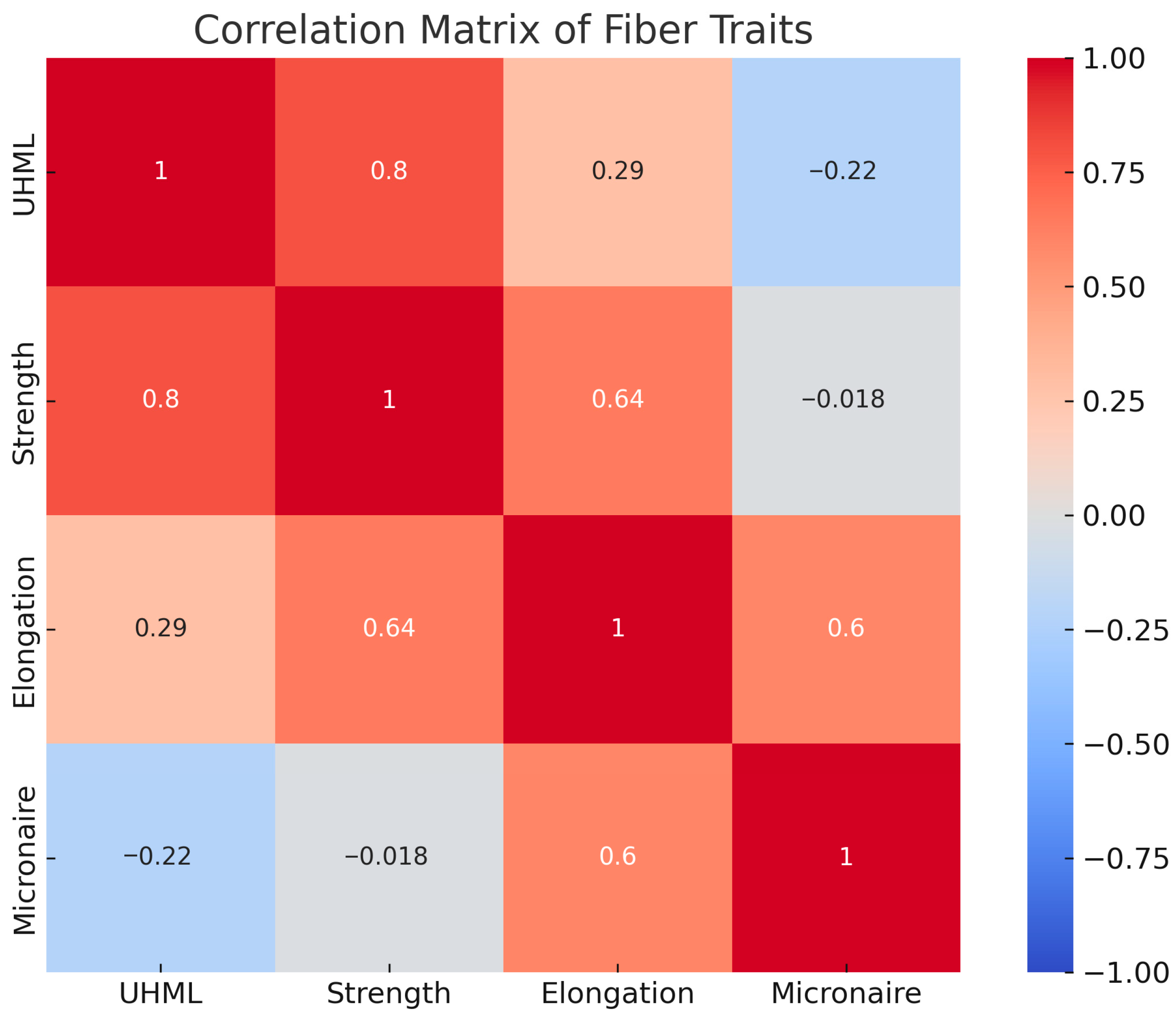 18]. Among these, upper half mean length (UHML), fiber strength (FS), fiber elongation (FE), and fiber micronaire (FM, an indicator of fiber fineness and maturity) are critical determinants of spinning efficiency and textile performance [
