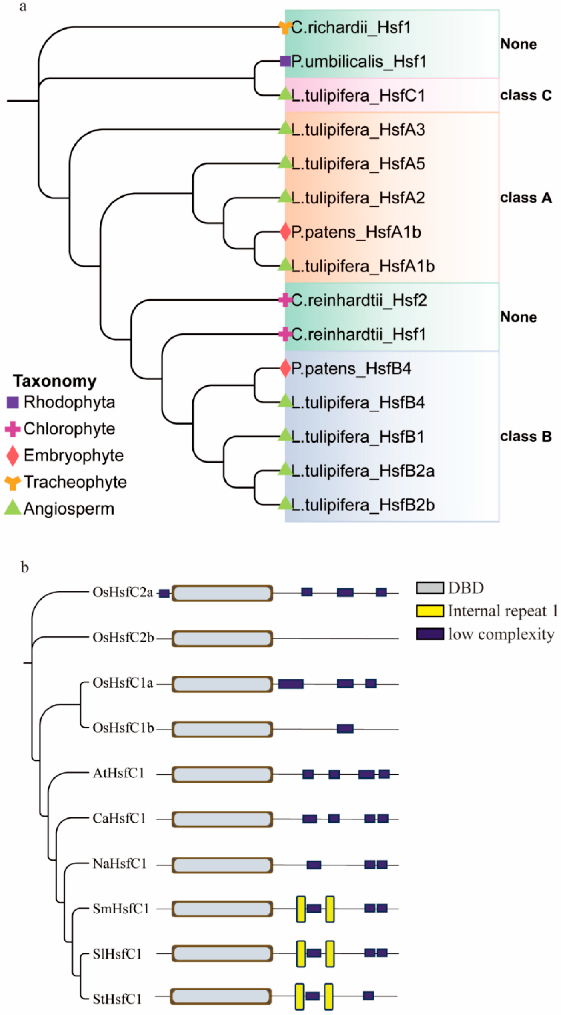The Hsf family genes are present in primitive eukaryotes of the Rhodophyta, with only one Hsf gene identified in Porphyra umbilicalis (PumHsf1). In the algae Chlamydomonas reinhardtii, two Hsf genes, CreHsf1 and CreHsf2, are present. These genes later diverged into the Hsf A and Hsf B subfamilies. Similarly, in the embryophyte Physcomitrium patens, the genes PpaHsfA1b and PpaHsfB4 represent these subfamilies. Angiosperms (Liriodendron tulipifera) are notable for being the first to develop Hsf C subfamily genes, along with more extensive Hsf A and Hsf B gene repertoires. Evolutionarily, it appears that C-class Hsf subfamily genes evolved from Hsf A subfamily genes. (Figure 1a).