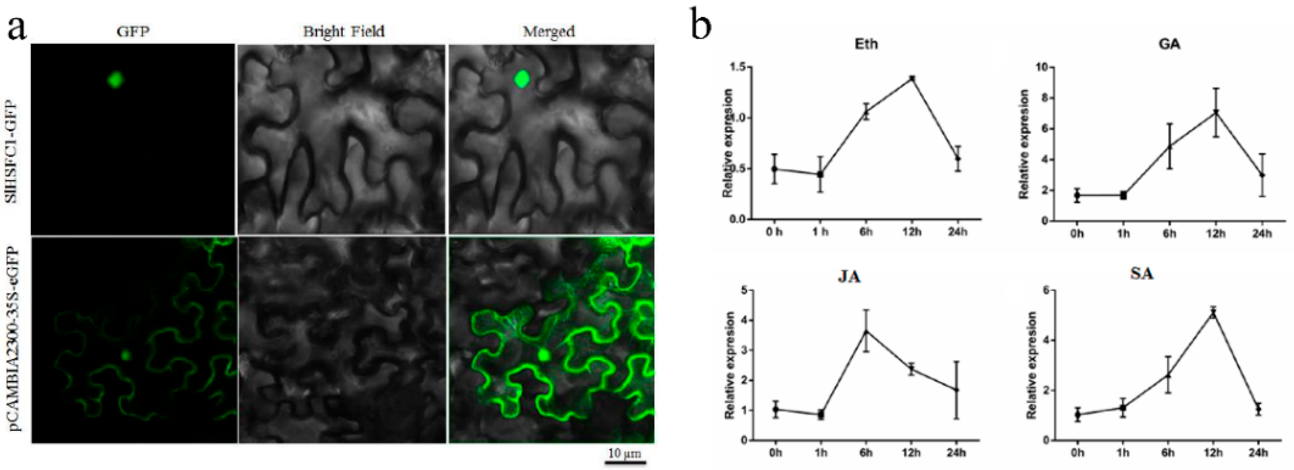 SlHsfC1 was transiently expressed in tobacco leaves using the pBinary 35S-SlHsfC1-eGFP construct and was localized predominantly in the nucleus, whereas the control vector pbinary 35S-eGFP was localized in the cytoplasmic nucleus (Figure 2a). Furthermore, SlHsfC1 was found to respond to treatments with gibberellin, salicylic acid, jasmonic acid, and ethylene (Figure 2b).