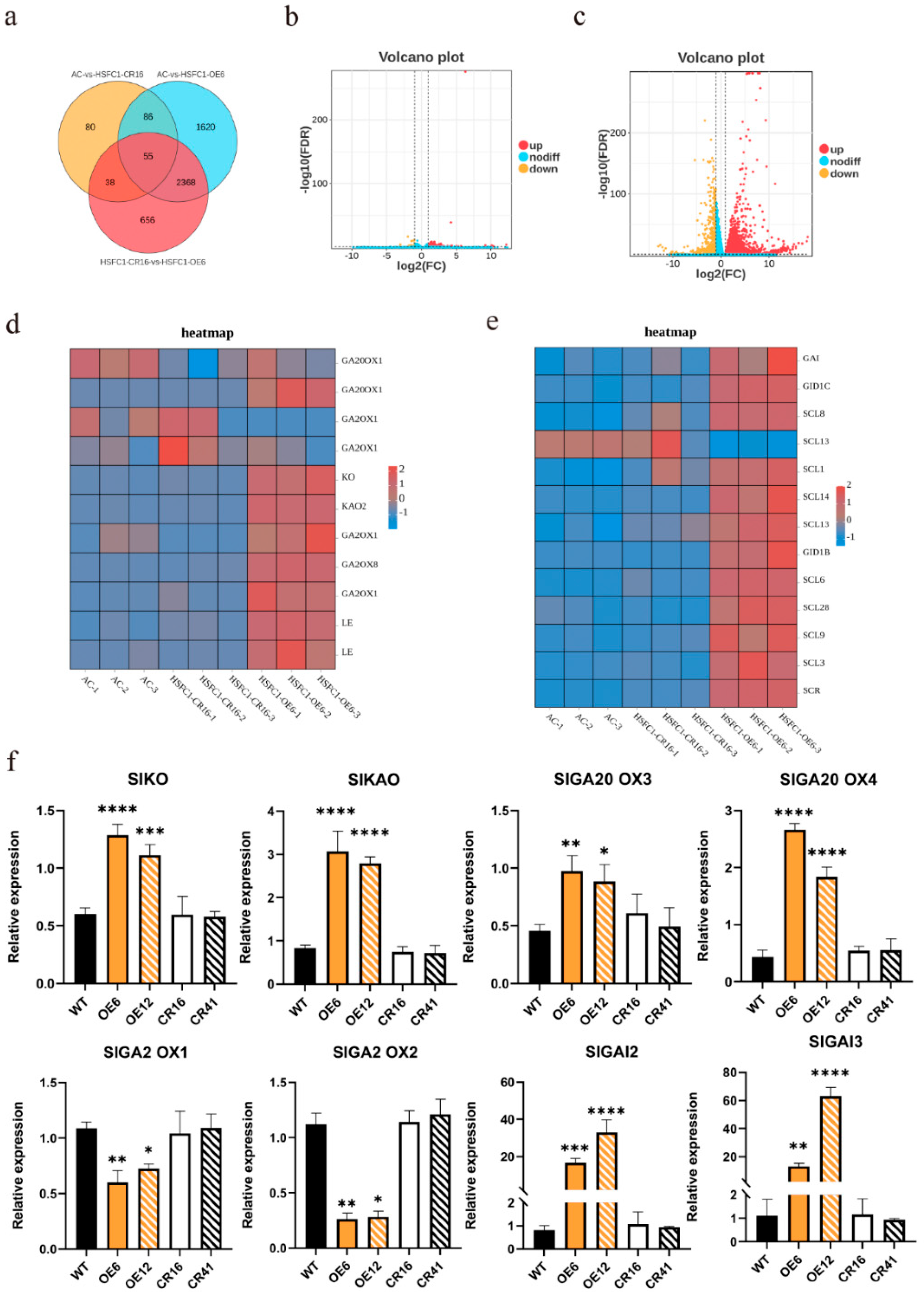 Figure 6. Genes of the GA pathway expression in overexpressing lines, Crispr lines and wild type. (a) Venn diagram showing differentially expressed genes (DEGs) among wild-type (AC), SlHsfC1-overexpressing lines (OE6, OE12), and CRISPR-Cas9 knockout lines (CR16, CR41) based on RNA-Seq analysis. (b,c) Volcano plots showing differentially expressed genes (DEGs) in transcriptome comparisons between wild-type (AC) and SlHsfC1-overexpressing lines (OE6, OE12), as well as between wild-type and CRISPR-Cas9 knockout lines (CR16, CR41). Significantly upregulated genes (|log2FC| > 1, FDR < 0.05) are highlighted in red, downregulated genes in brown, and non-significant genes in blue. (d) Expression of gibberellin biosynthesis genes of RNA-Seq suggest that key genes. (e) Expression of gibberellin signal genes of RNA-Seq suggest that key genes. (f) RT–qPCR analysis validated the RNA-Seq results, confirming the altered expression of key genes involved in GA biosynthesis and GA signal transduction. Statistical significance was determined by Student’s t-test (n = 3): * p  <  0.05, ** p  <  0.01, *** p  <  0.001, **** p  <  0.0001.