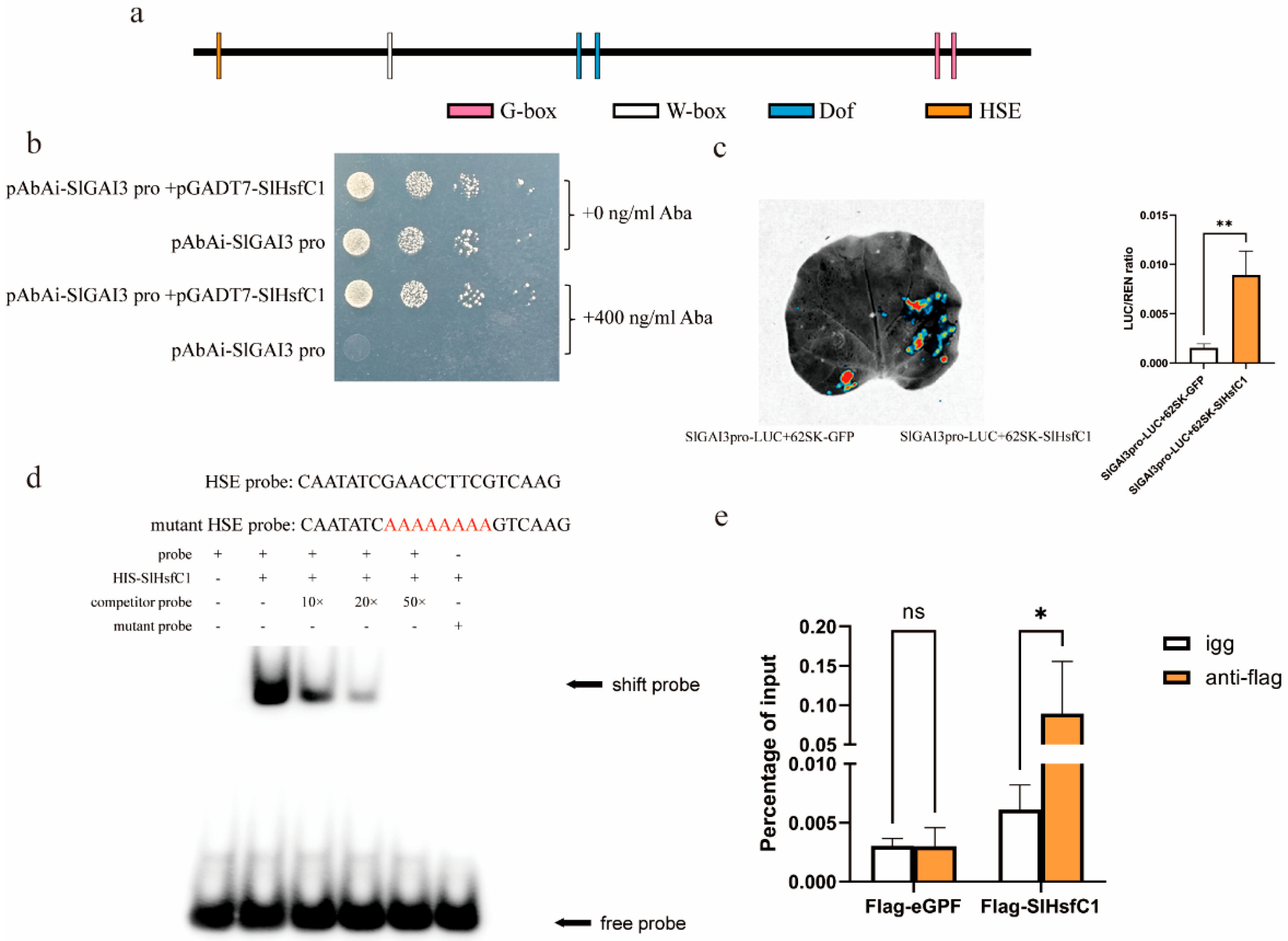 Figure 7. SlHsfC1 protein binds to the HSE element on the SlGAI3 promoter and activates the transcription of SlGAI3. (a) Analysis of Cis-Acting Elements on the SlGAI3 promoter. (b) The pAbAi-SlGAI3pro and pGADT7-SlHsfC1 plasmids were co-introduced into Y1HGold yeast cells, which were subsequently grown on SD/-Leu/-Ura agar supplemented with 400 ng/mL aureobasidin A (AbA) for selection. (c) The dual-luciferase assay, pGreen0800-SlGAI3pro and pGreen62SK-SlHsfC1 were transiently co-transformed into Nicotiana benthamiana leaves. The co-infiltration of pGreen0800-SlGAI3pro with empty vector pGreen62SK served as the control. Statistical significance was assessed using Student’s t-test (n = 3). ** p  <  0.01. (d) EMSA assay. The biotin-labeled probe (biotin-GAANNTTC-) served as the experimental probe, while cold competitor probes (-GAANNTTC-) were added at 10×, 20×, and 50× molar excess to assess binding specificity. A mutant probe (biotin-AAAAAAAA-) was included as a negative control. (e) ChIP-qPCR of Flag-SlHsfC1 and SlGAI3 promoter. Statistical significance was assessed using two-way ANOVA (n = 3). * p  <  0.05.