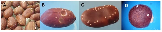 Rearing of Specularius impressithorax on economic non-Erythrina plants. (A) Peanut, Arachis hypogaea: oviposition and partial development; (B) peanut showing adult emergence holes; (C) broad bean, Vicia faba; (D) pigeon pea, Cajanus cajan.