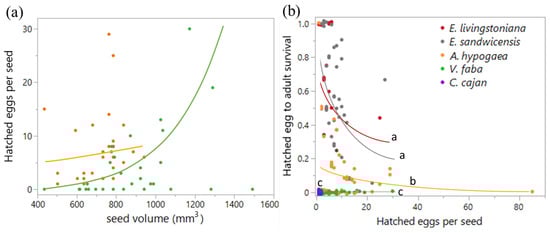 Hatched-egg density differed between plant species (Wald χ21 = 22.58, p < 0.0001) and changed with seed volume (Wald χ21 = 17.69, p < 0.0001) on peanuts and broad beans (Figure 3a). The plant species × seed volume interaction was marginally significant (Wald χ21 = 3.62, p = 0.057). When analyzed separately, hatched egg density on A. hypogaea did not correlate with seed volume (Wald χ21 = 0.86, p = 0.355), whereas on V. faba it increased significantly with seed volume (Wald χ21 = 8.29, p = 0.004).