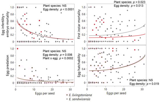 Effects of Erythrina species and egg density on the egg survival in Specularius impressithorax. No difference in mortality traits was found between Erythrina livingstoniana and E. sandwicensis (Wiliwili), except in the first instar mortality (higher on Wiliwili). Overall egg survival (hatchability) was positively correlated with egg density per seed. Line: model prediction. Data points are jittered along the y-axis.