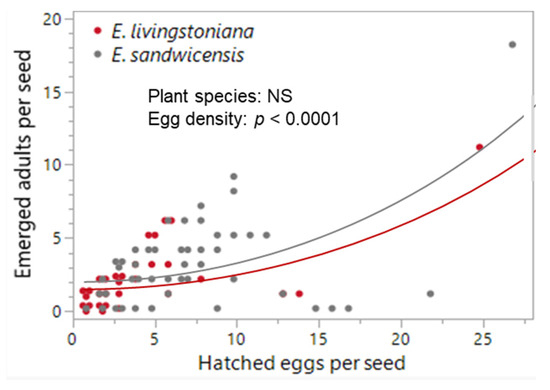 No difference was detected between the two Erythrina species in mortality traits or hatchability, except first-instar mortality, which was higher on E. sandwicensis (p = 0.023; Table 1, Figure 4 and Figure A1). Egg-density effects were significant for infertility + embryo mortality (negative; p < 0.0001), predation (host × egg density interaction p = 0.0002; negative only on E. livingstoniana p = 0.0002, on E. sandwicensis p = 0.266), first-instar mortality (positive; p = 0.013), and hatchability (positive; p < 0.0001) (Table 1, Figure 4 and Figure A1). Survival from hatched eggs to adults did not correlate with hatched-egg density per seed (p = 0.200; Table 1, Figure 3b). The number of emerged adults per seed did not differ between the two Erythrina hosts (Wald χ21 = 1.05, p = 0.305) but increased with hatched-egg density (Wald χ21 = 16.46, p < 0.0001) (Figure 5). Maximum adult emergence per seed was 18 for E. sandwicensis and 11 for E. livingstoniana.