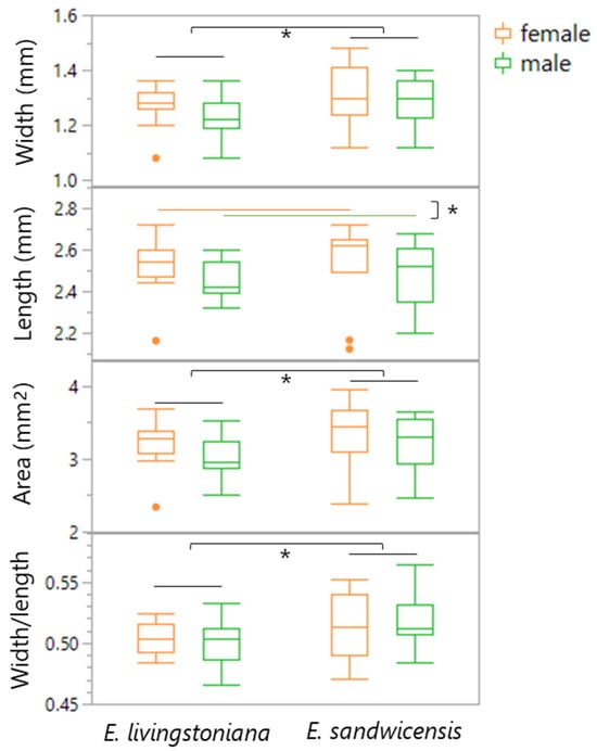 Box plots of adult morphological traits (elytron width, length, area, and width/length ratio) by sex of Specularius impressithorax emerging from Erythrina livingstoniana and E. sandwicensis (Wiliwili). Elytral width, area, and width/length ratio were different between rearing plant species, while elytral length was different between sexes, but not between rearing plants. *: p < 0.05.