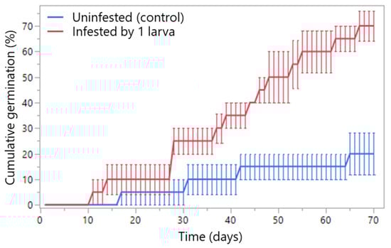 Time to germination differed significantly between treatments (LR χ21 = 12.52, p = 0.0004), with infested seeds (by single early-stage larva) germinating earlier than uninfested controls (Figure 7). Replicate effects were non-significant (LR χ26 = 4.23, p = 0.646). Final cumulative germination (day 70) reached 70.0 ± 5.77% for infested seeds, which was higher than 20.0 ± 8.16% for uninfested seeds (F1,6 = 25.00, p = 0.0025). All larvae died at the second instar, probably due to drowning.