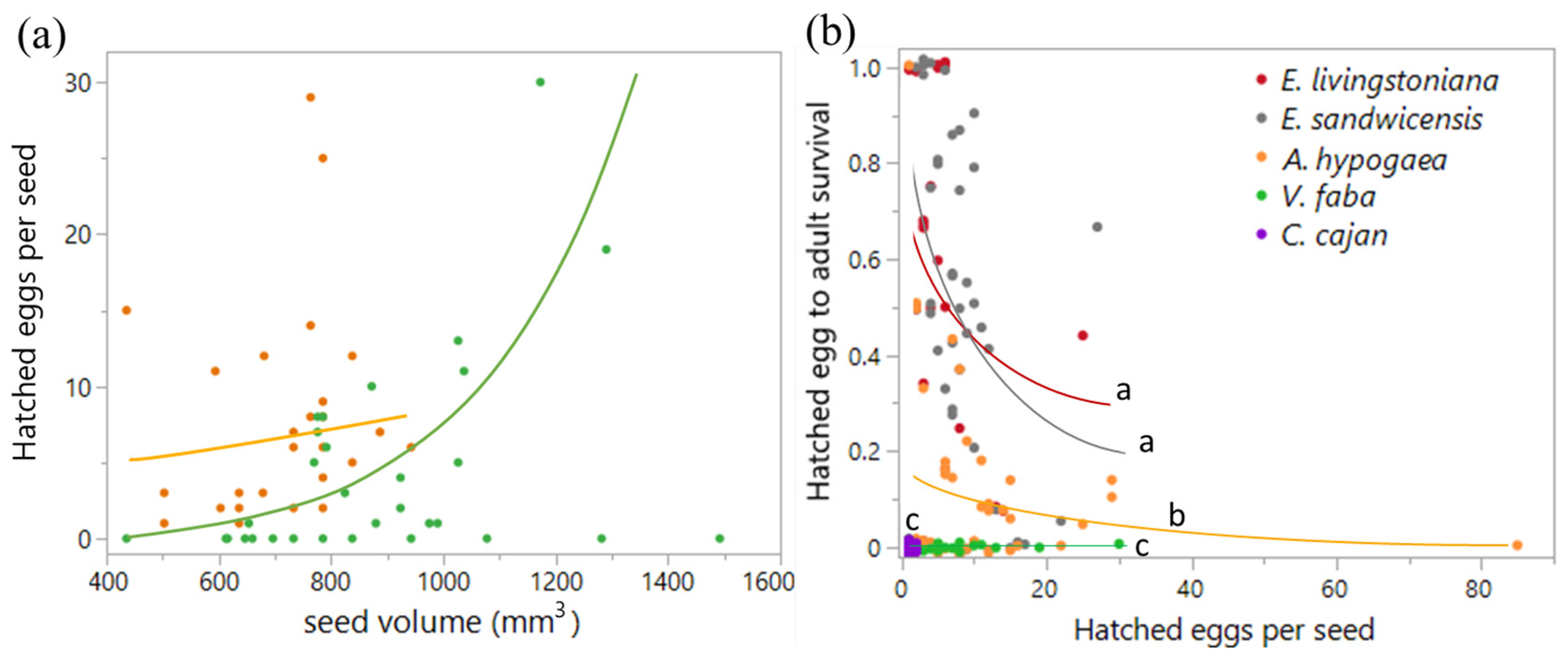 Figure 3. Specularius impressithorax oviposition and survival on different plant seeds. (a) Number of hatched eggs per seed increased with seed volume on broad bean V. faba (p = 0.004) but not on peanut A. hypogaea (p = 0.355). (b) Survival from hatched eggs to adulthood was different among plant species (p < 0.0001) and decreased with increasing hatched-egg density per seed (p < 0.0001) with plant species × hatched-egg density interaction (p < 0.0001). Shared letters indicate no significant difference. C. cajan: Cajanus cajan (pigeon pea). Line: model prediction. Jittered points in (b).